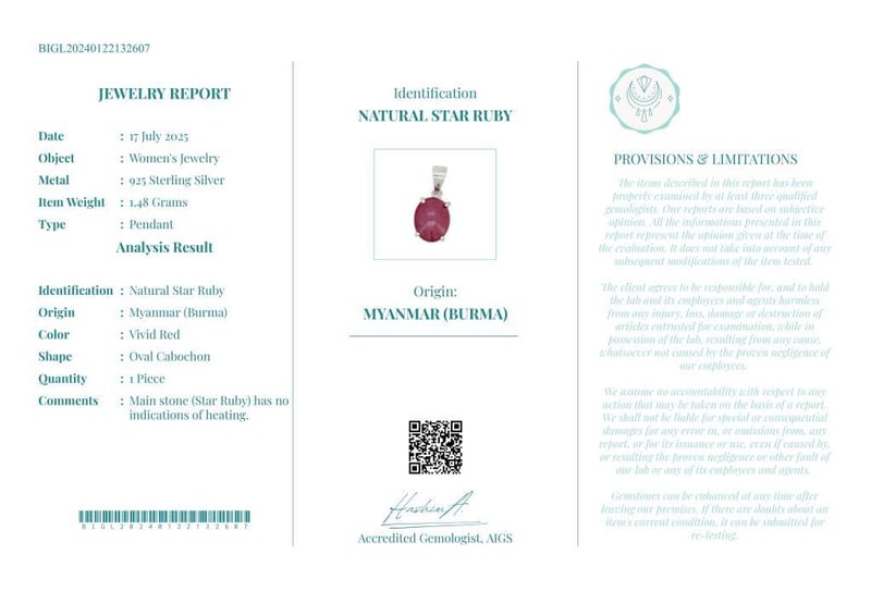 Comments : Main Stone (Star Ruby) Has No Indications Of Heating.