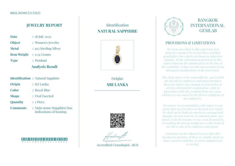 NATURAL SRI LANKAN SAPPHIRE PENDANT ON 925 SILVER - WITH CERTIFICATE Gemstone : Natural Sri Lankan SapphireCertificate Number : Bigl20240122132622Item Total Weight : 0.74 GramsMain Stone Color : Royal BlueSize : Comments : Main Stone (Sapphire) Has Indications Of Heating. ✻ Verify Report Online At Www.Bangkokinternationalgemlab.Co 0+10