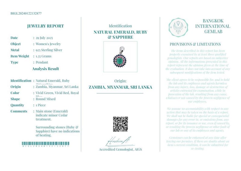 Comments : Main Stone (Emerald) Indicate Minor Cedar Treatment.
