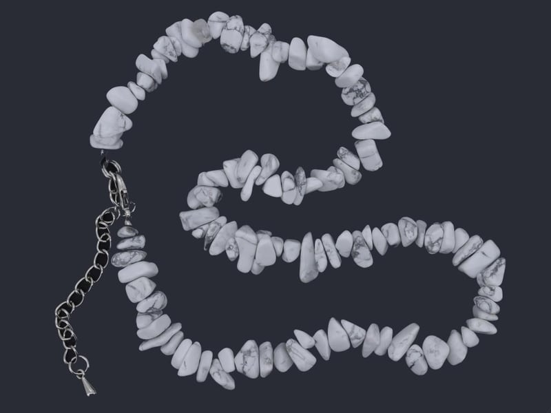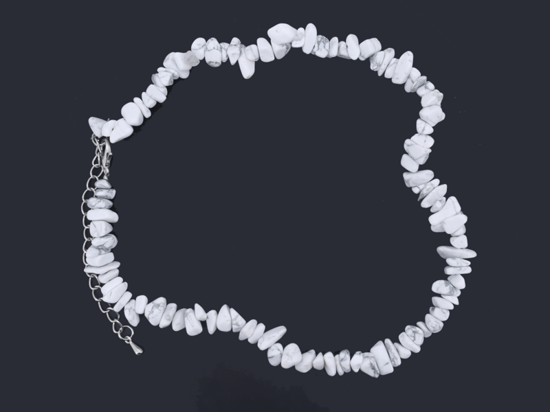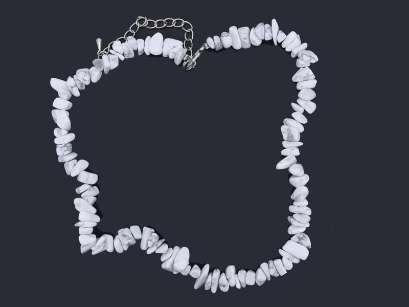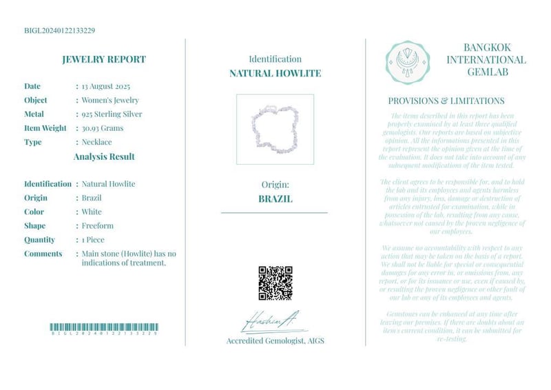 NATURAL HOWLITE FREEFORM NECKLACE ON 925 SILVER - WITH CERTIFICATE Gemstone : Natural Howlite FreeformCertificate Number : Bigl20240122133229Item Total Weight : 30.93 GramsMain Stone Color : WhiteSize : Comments : Main Stone (Howlite) Has No Indications Of Treatment. ✻ Verify Report Online At Www.Bangkokinternationalgemlab.Co 0+50