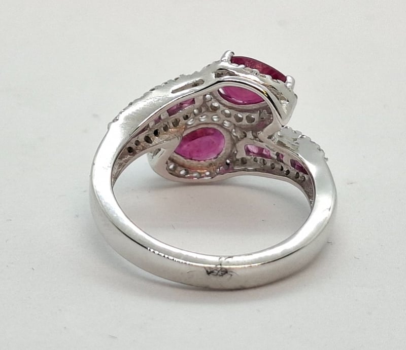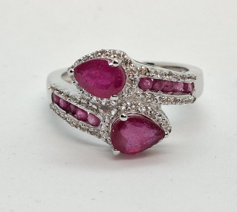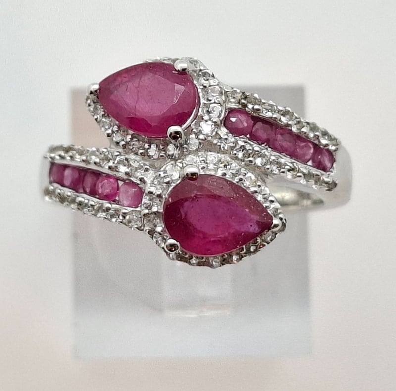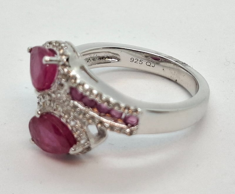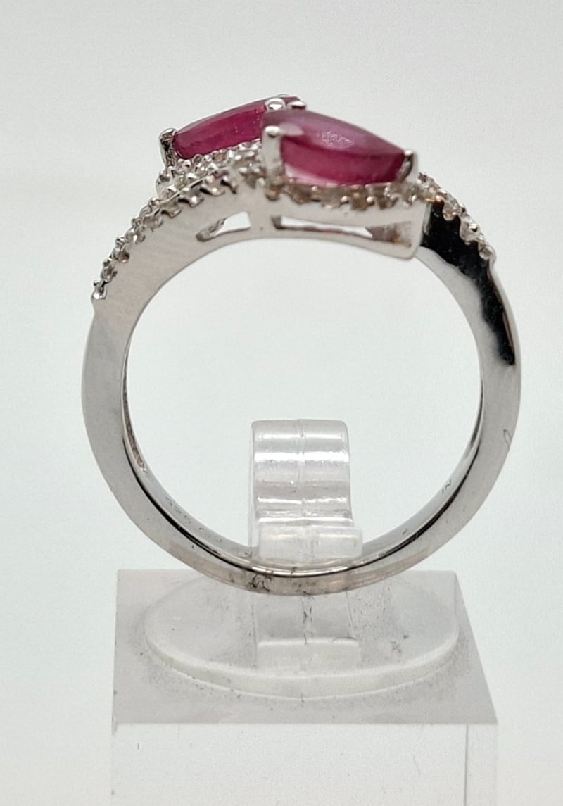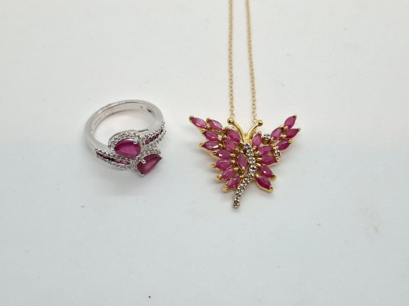 PINK RUBY AND DIAMOND RING, AND PINK RUBY BUTTERFLY NECKLACERing Features Two Pear Cut Ruby Gems Off-Centered Claw Settings, With Ten Smaller Brilliant Cut Ruby Gems Following Band. Brilliant Cut Diamonds Along Outside Of Band.Necklace Features Twenty Marquise Cut Ruby Gems, With Eleven Smaller Brilliant Cut Diamonds In Centre.Markings: Stamped '925' On Ring And NecklaceCondition: Good - Refer To Images585046+2