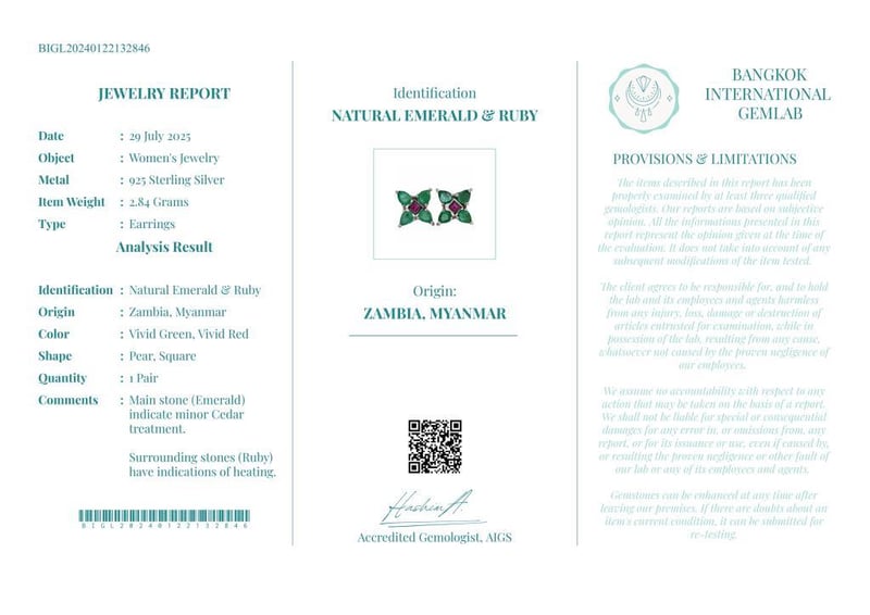 Comments : Main Stone (Emerald) Indicate Minor Cedar Treatment.