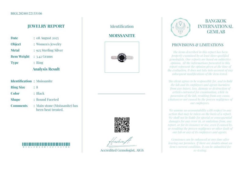 MOISSANITE RING ON 925 SILVER - WITH CERTIFICATE Gemstone : MoissaniteCertificate Number : Bigl20240122133106Item Total Weight : 3.42 GramsMain Stone Color : BlackSize : 8Comments : Main Stone (Moissanite) Has Been Heat Treated. ✻ Verify Report Online At Www.Bangkokinternationalgemlab.Co 0+42