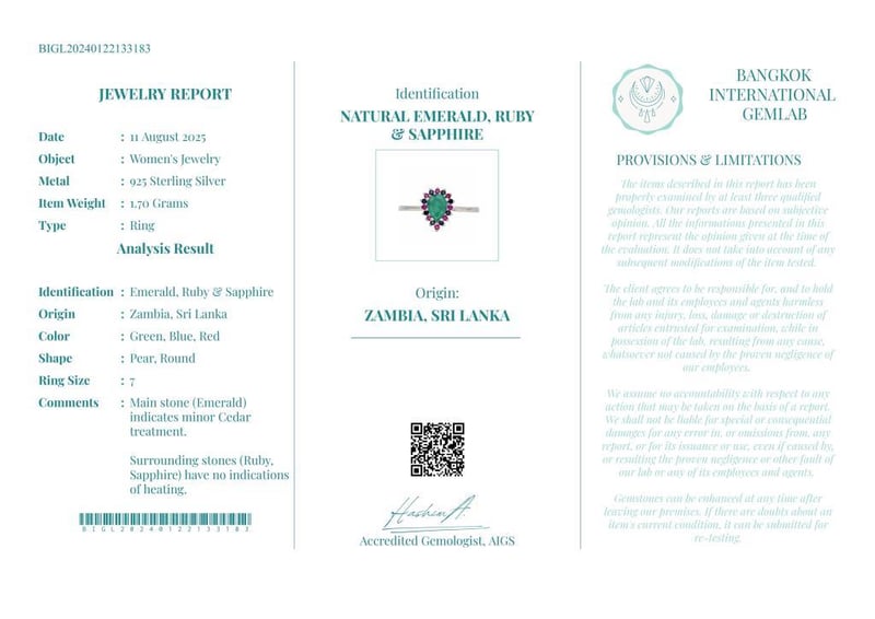 Comments : Main Stone (Emerald) Indicates Minor Cedar Treatment.