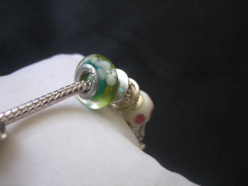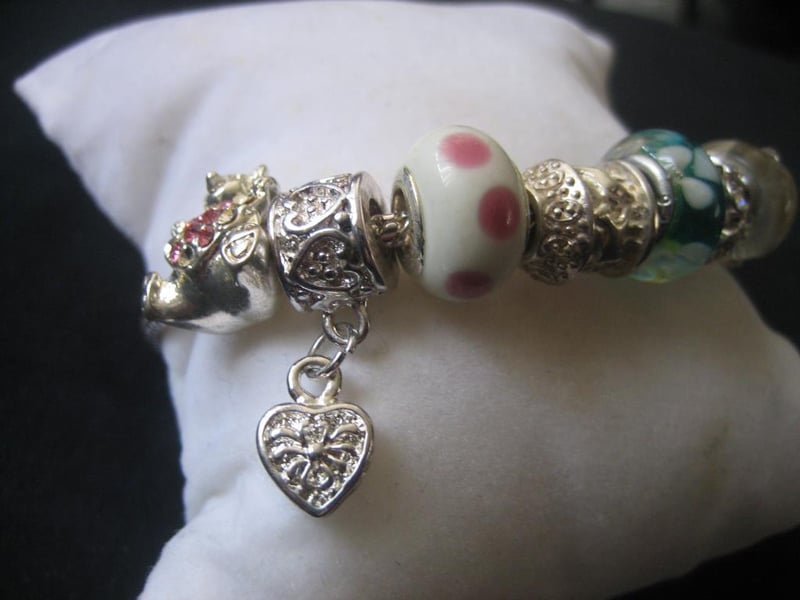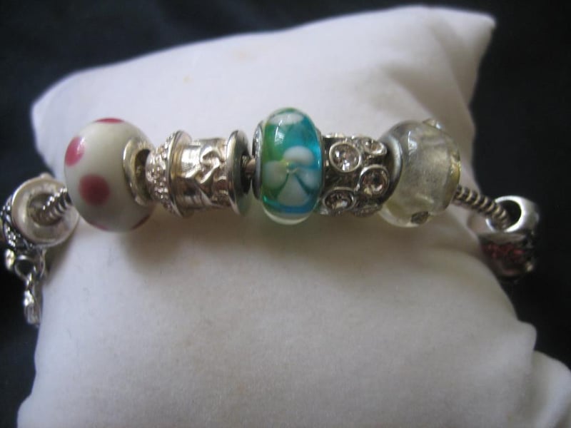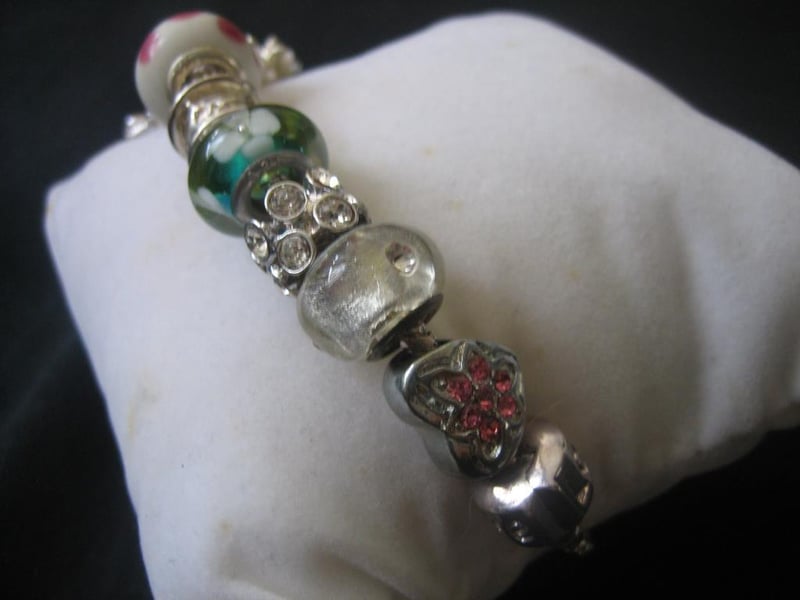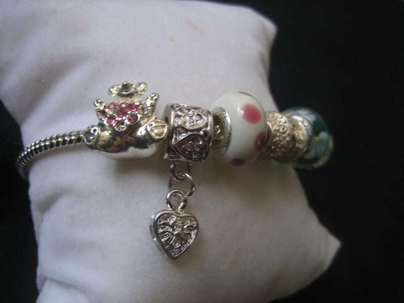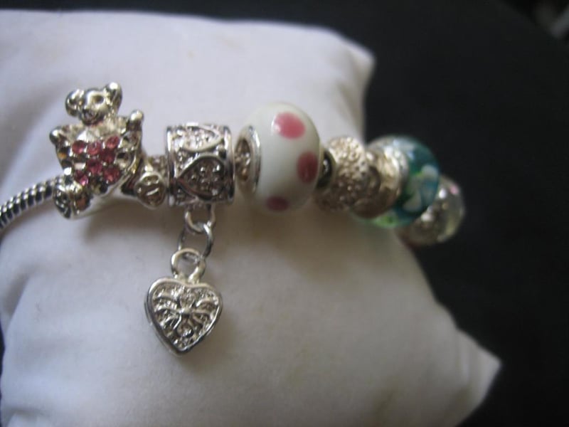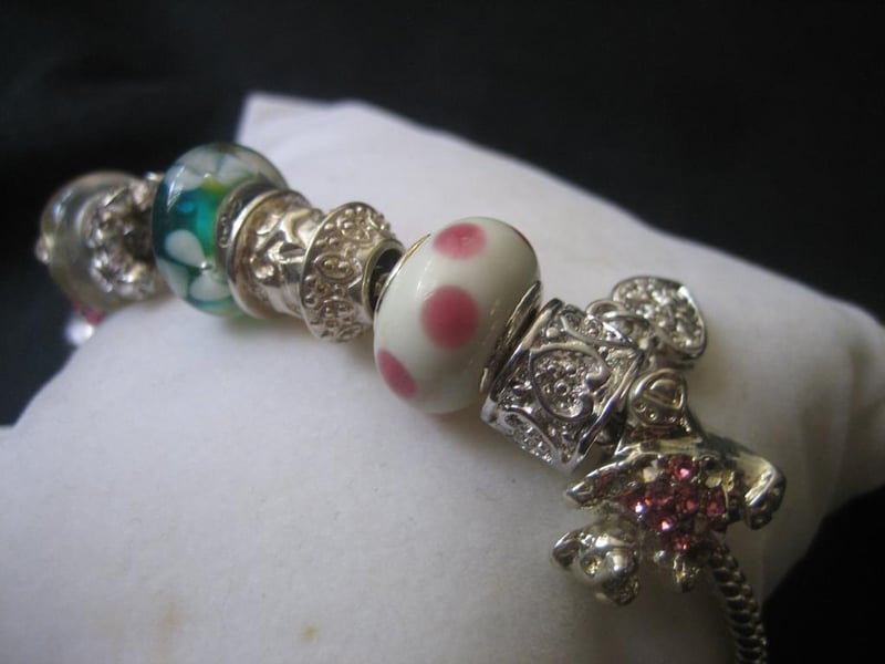 Pink & Green Bracelet with a total of 8x Charms and Beads, stamped 925, approx.20cm in length.