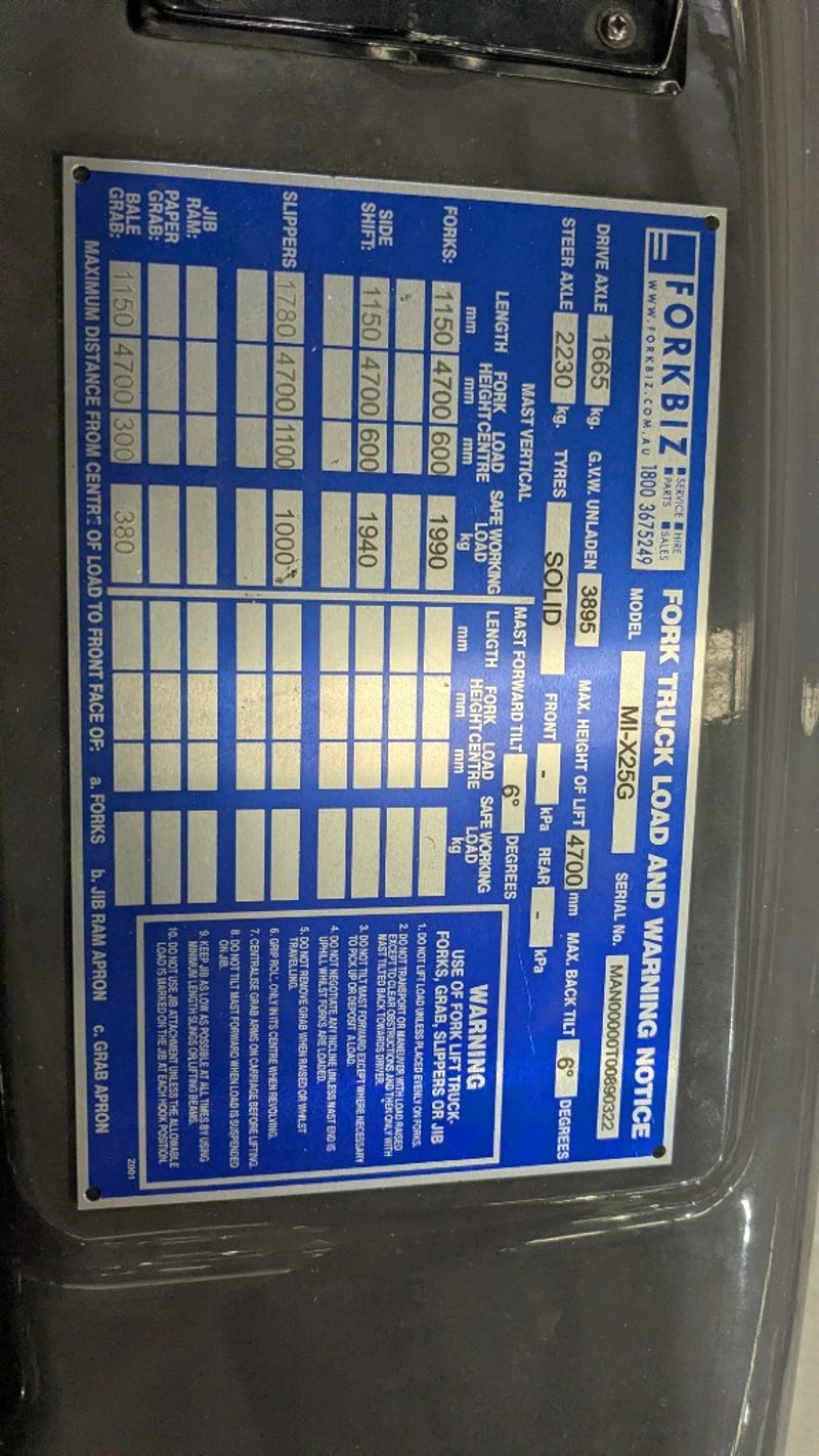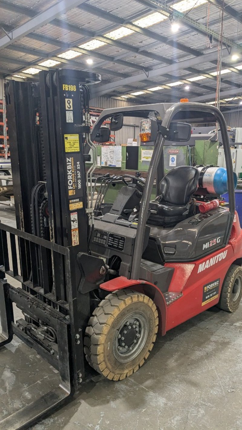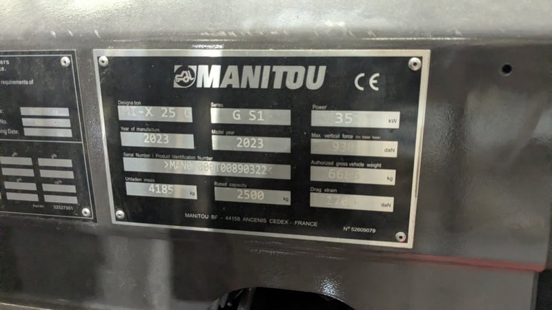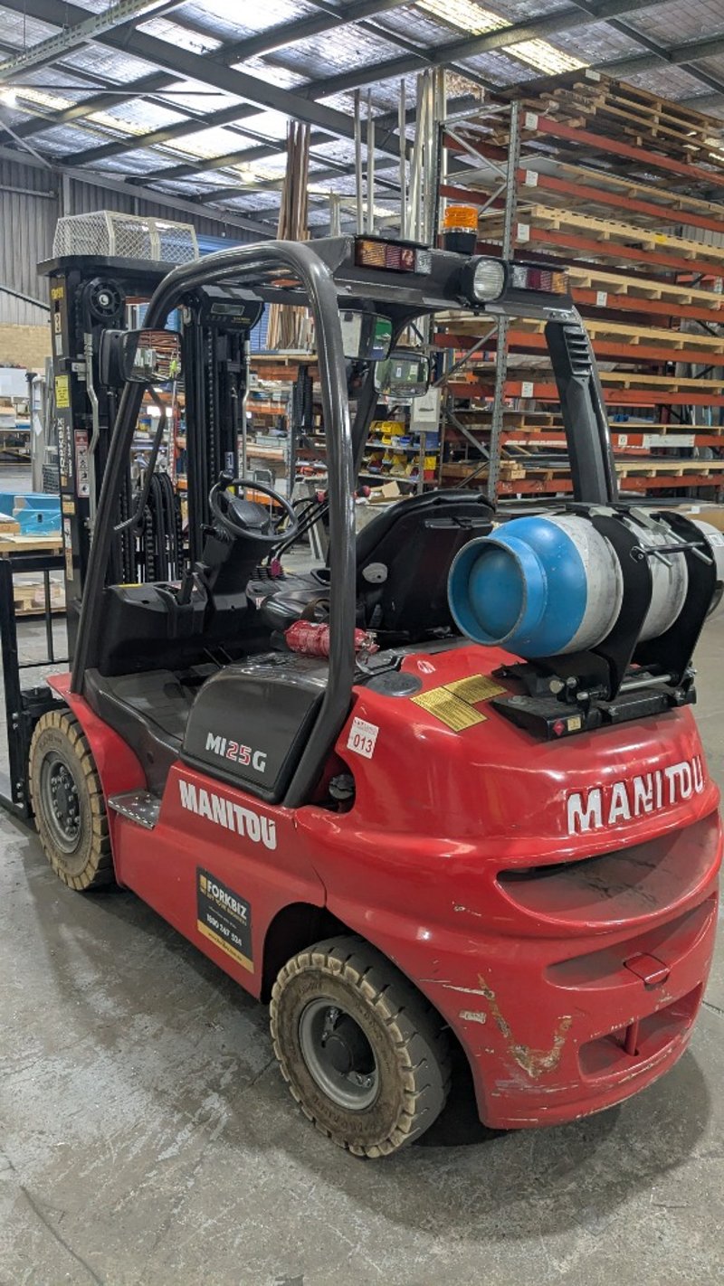 2.5t Manitou MI-X25G Forklift Brand: Manitou Model: MI-X25G Serial no: man00000T00890322 Hrs Indicated: 1022.4hrs Fuel: LPG Year of Manufacture: 2023 Descriptio/Extras: Max Height 4700mm, Solid Tyres, Work Lights, Side Shift, Safety Scales, Manual Adjustment Tines Fork Dimensions: 1150mm(L) NOTE: INSPECTIONS HIGHLY RECOMMENDED, BUYER TO PROVIDE OWN LABOUR AND TOOLS FOR SAFE REMOVAL OF ASSET