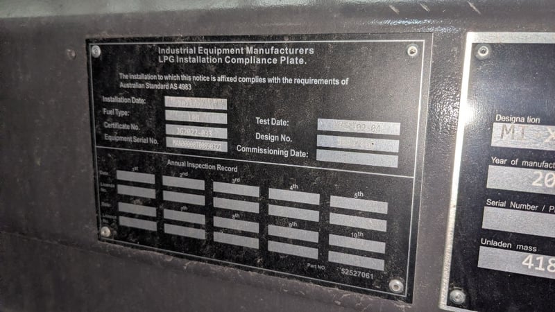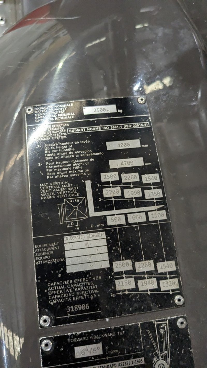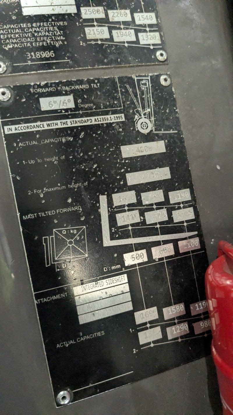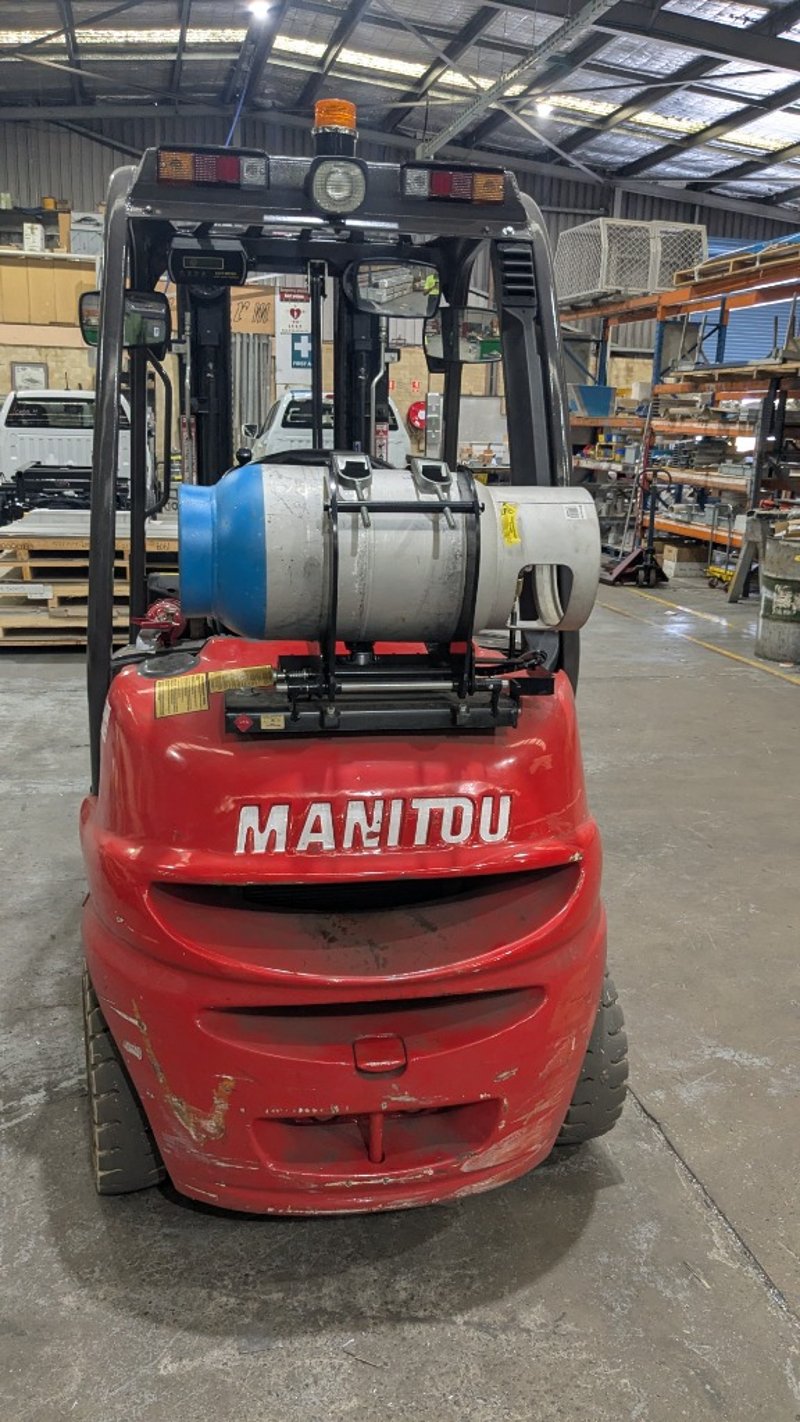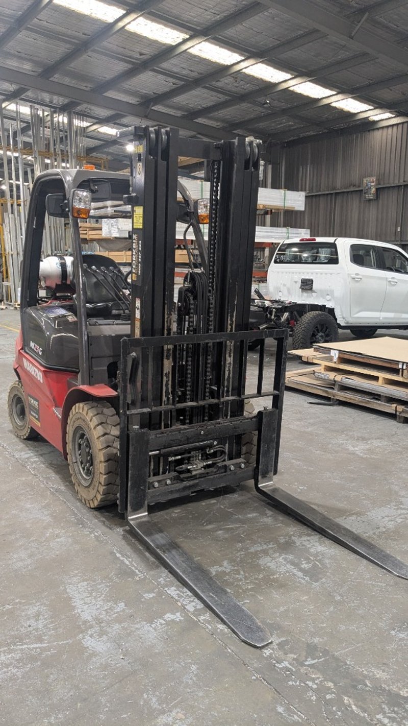 2.5t Manitou MI-X25G Forklift Brand: Manitou Model: MI-X25G Serial no: man00000T00890322 Hrs Indicated: 1022.4hrs Fuel: LPG Year of Manufacture: 2023 Descriptio/Extras: Max Height 4700mm, Solid Tyres, Work Lights, Side Shift, Safety Scales, Manual Adjustment Tines Fork Dimensions: 1150mm(L) NOTE: INSPECTIONS HIGHLY RECOMMENDED, BUYER TO PROVIDE OWN LABOUR AND TOOLS FOR SAFE REMOVAL OF ASSET
