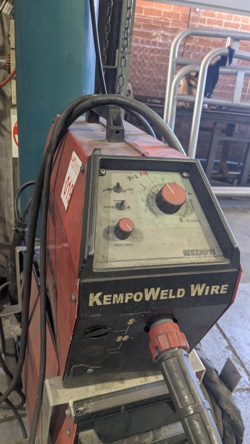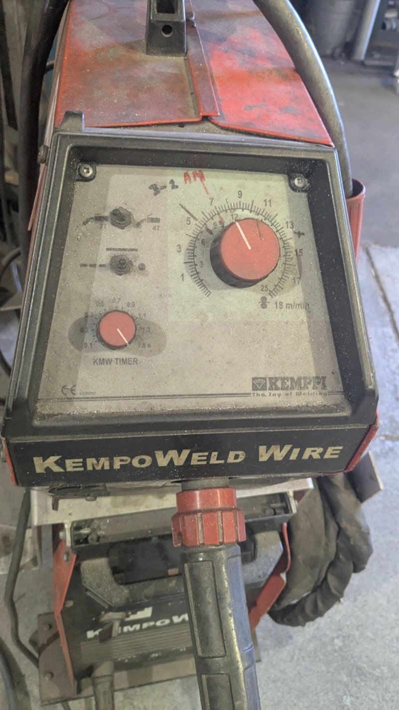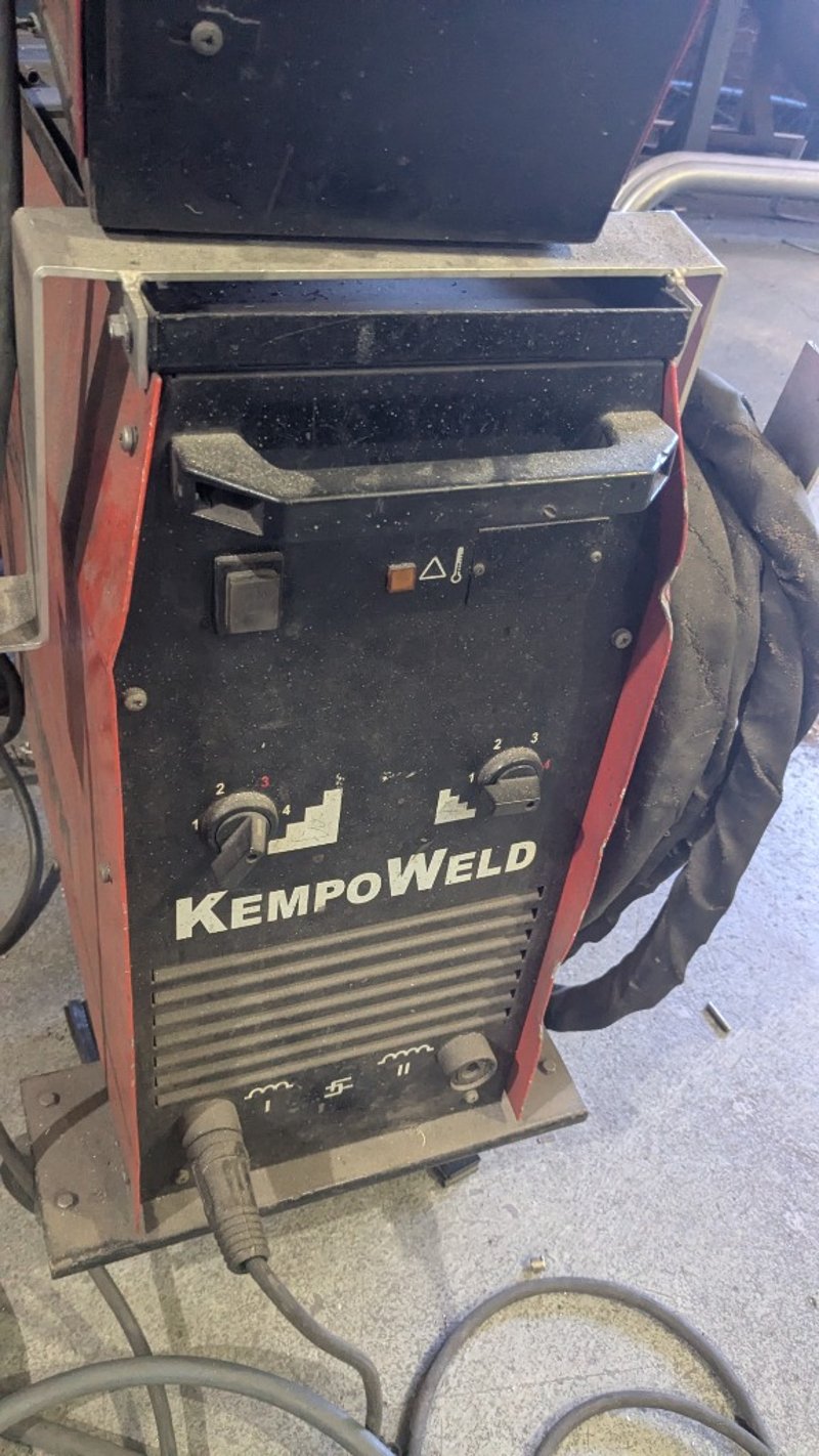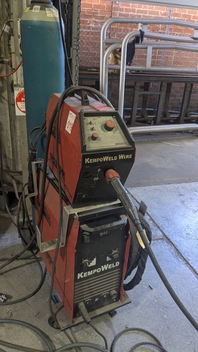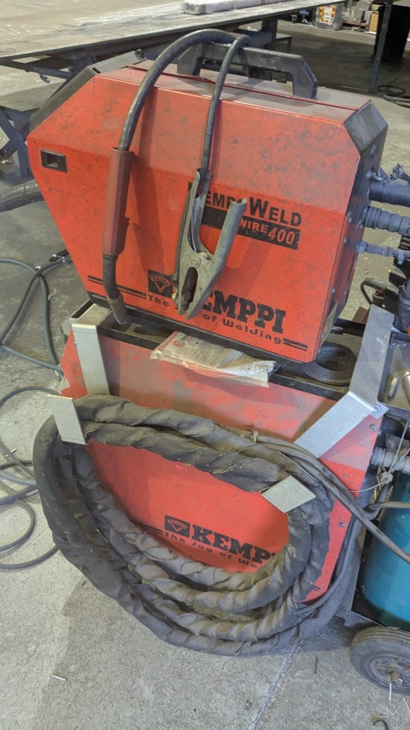 Kemppi Kempoweld 3200 MIG/MAG welding machine Brand: KemppiModel: Kempoweld 3200Serial no: 1125245pDescription/Extras: 3 Phase Power, Max Amp 320, Max 40 Step voltage, Wire 400 Wire Feeder SOLD AS LOT NOTE: GAS BOTTLE NOT INCLUDED, INSPECTIONS HIGHLY RECOMMENDED, BUYER TO PROVIDE OWN LABOUR AND TOOLS FOR SAFE REMOVAL OF ASSET