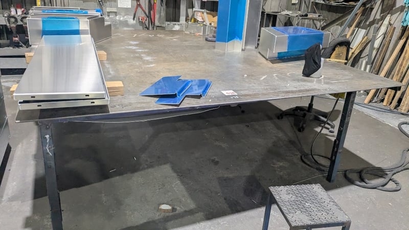 Metal Workbench, 5mm Plate Top Dimensions: 2410mm(W) x 2460mm(D) x 900mm(H) NOTE: CONTENTS NOT INCLUDED, INSPECTIONS HIGHLY RECOMMENDED, BUYER TO PROVIDE OWN LABOUR AND TOOLS FOR SAFE REMOVAL OF ASSET
