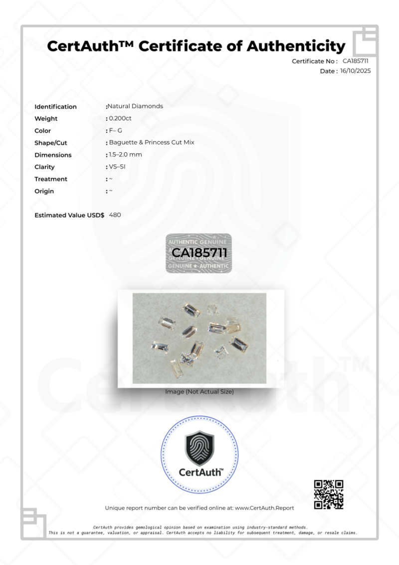 NATURAL DIAMOND PARCEL – 0.20CT (BAGUETTE & PRINCESS MIX), CERTIFIED BY CERTAUTH