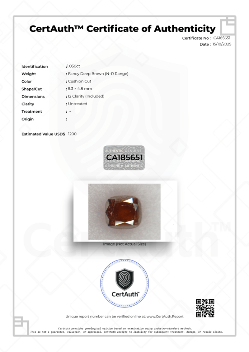 NATURAL DIAMOND – 1.05CT FANCY DEEP BROWN, CERTIFIED BY CERTAUTH