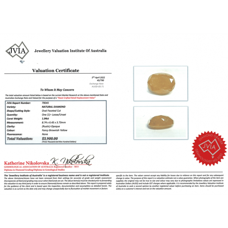 Oval Faceted Cut, Fancy Brownish-Yellow, Opaque, Loose, Unset.
