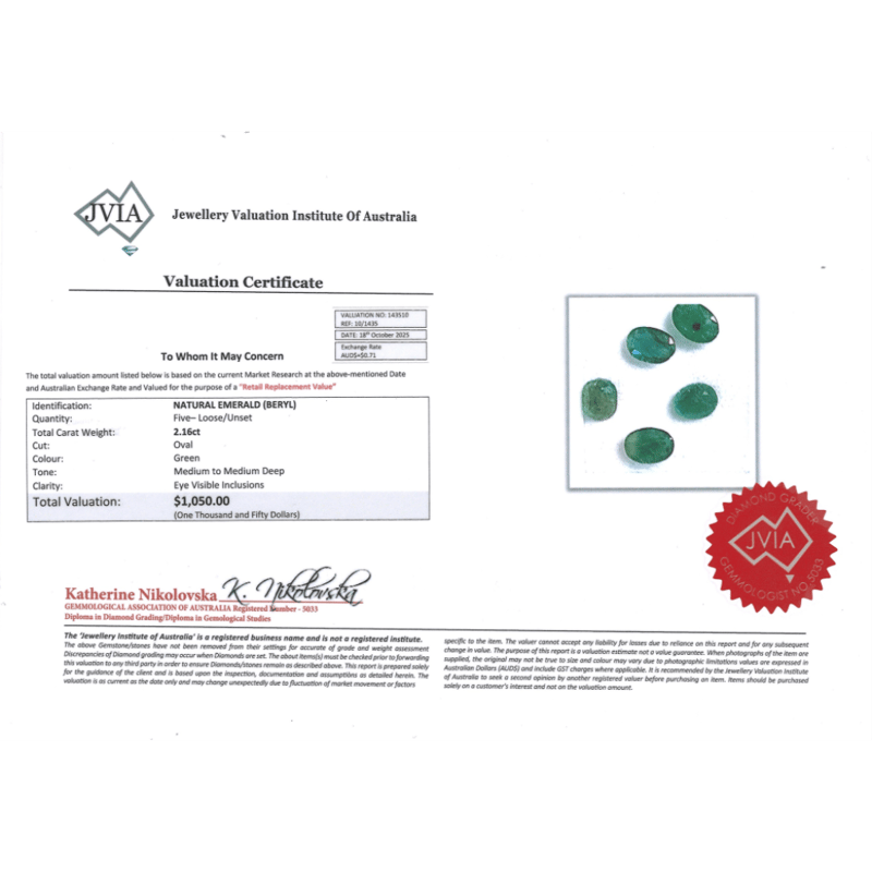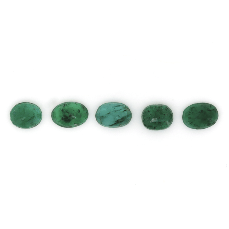 2.16CT TSW X 5, NATURAL EMERALDS Oval Cut, Medium-Deep Green, Eye Visible Inclusions, Loose, Unset. Jewellery Valuations Provided By A Third Party Professional Not Directly Associated With Lloyds Auctions at AUD $1,050.00This Insurance Valuation has been provided by a registered Jewellery Valuer and is intended for insurance purposes only. The valuation amount has no bearing on the auction value of the item. Any questions regarding the valuation should be directed to the issuing Valuer (refer to contact details on the certificate) as Lloyds have no association or relationship with the Valuer or the valuation amount contained within the valuation. Condition: NEW 0645890+2290