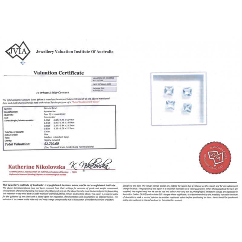 3.52CT TSW X 4, NATURAL AQUAMARINES