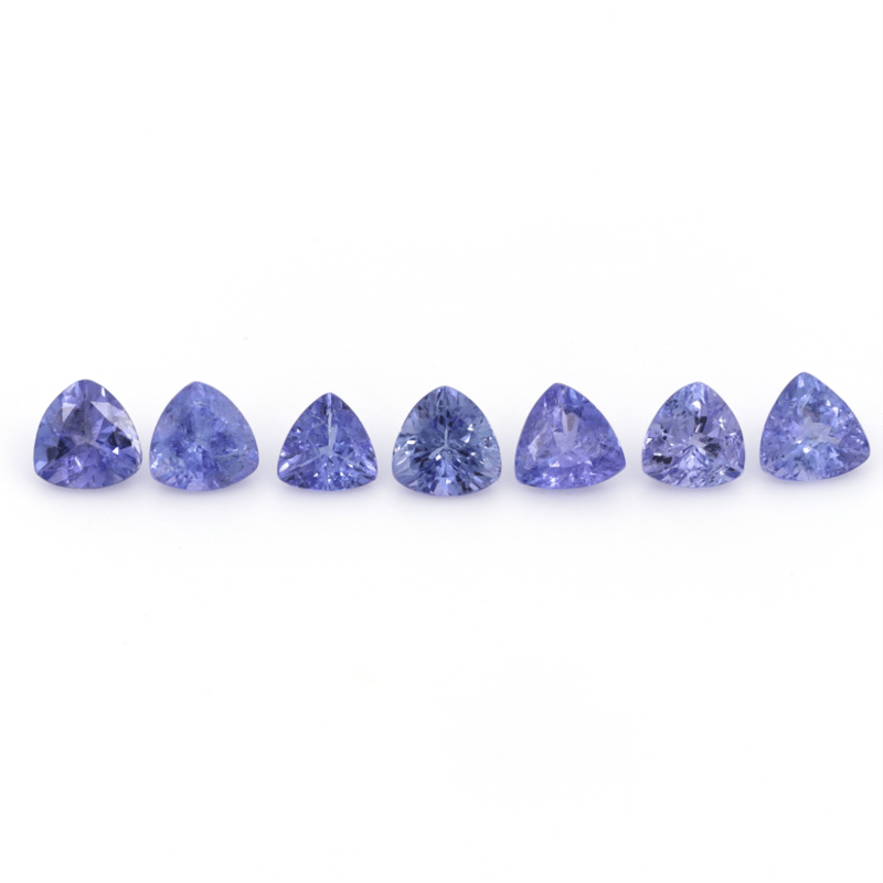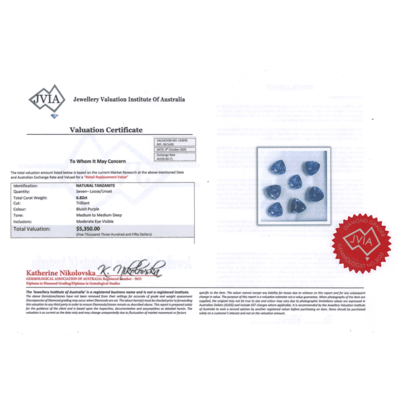 6.82CT TSW X 7, NATURAL TANZANITES Trilliant Cut, Medium-Deep Bluish-Purple, Moderate Eye Visible Inclusions, Loose, Unset. Jewellery Valuations Provided By A Third Party Professional Not Directly Associated With Lloyds Auctions at AUD $5,350.00This Insurance Valuation has been provided by a registered Jewellery Valuer and is intended for insurance purposes only. The valuation amount has no bearing on the auction value of the item. Any questions regarding the valuation should be directed to the issuing Valuer (refer to contact details on the certificate) as Lloyds have no association or relationship with the Valuer or the valuation amount contained within the valuation. Condition: NEW 0645890+2272