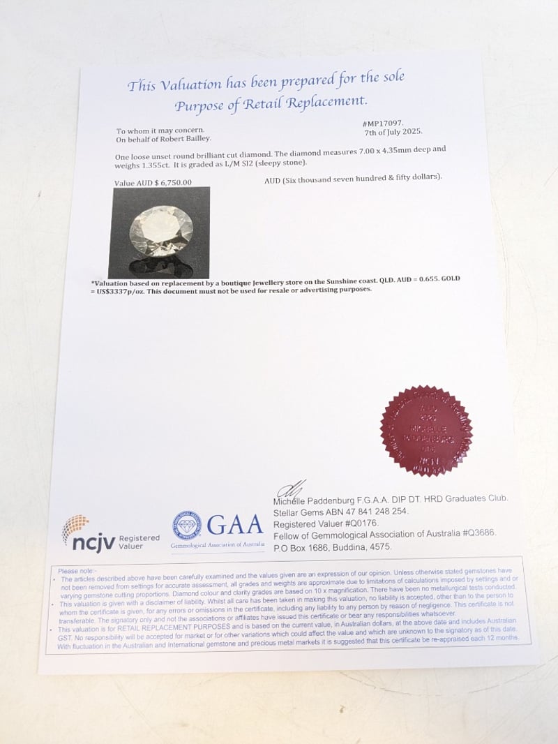 ROUND BRILLIANT CUT DIAMOND7 X 4.35Mm Deep, Weights = 1.355CtGrade: L/M Si2 (Sleepy Stone)Condition: Good - Refer To ImagesThis valuation has been conducted by an independent third-party professional. The valuation amount is an assessment by the issuing valuer and does not reflect the auction value of the item.Any inquiries regarding the valuation should be directed to the issuing valuer (refer to contact details on the certificate), as Lloyds Auctions has no affiliation or influence over the valuation, the valuer, or the stated amount.Insurance Replacement Valuation Amount: $6,750.00585025+60