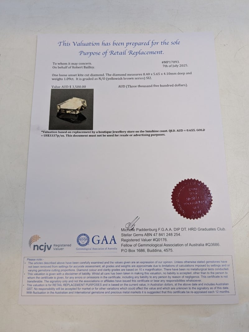 KITE CUT DIAMOND8.4 X 5.65 X 4.1Mm Deep, Weight = 1.09CtGrade: N/O (Yellowish Brown Series) Si2Condition: Good - Refer To ImagesThis valuation has been conducted by an independent third-party professional. The valuation amount is an assessment by the issuing valuer and does not reflect the auction value of the item.Any inquiries regarding the valuation should be directed to the issuing valuer (refer to contact details on the certificate), as Lloyds Auctions has no affiliation or influence over the valuation, the valuer, or the stated amount.Insurance Replacement Valuation Amount: $3,500.00585025+62