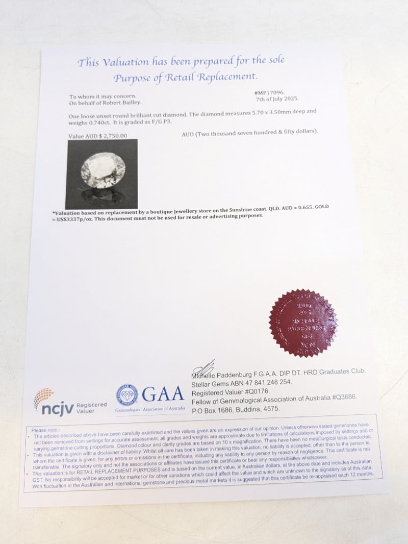 ROUND BRILLIANT CUT DIAMOND5.7 X 3.5Mm Deep, Weight = 0.740CtGrade = F/G P3Condition: Good - Refer To ImagesThis valuation has been conducted by an independent third-party professional. The valuation amount is an assessment by the issuing valuer and does not reflect the auction value of the item.Any inquiries regarding the valuation should be directed to the issuing valuer (refer to contact details on the certificate), as Lloyds Auctions has no affiliation or influence over the valuation, the valuer, or the stated amount.Insurance Replacement Valuation Amount: $2,750.00585025+59