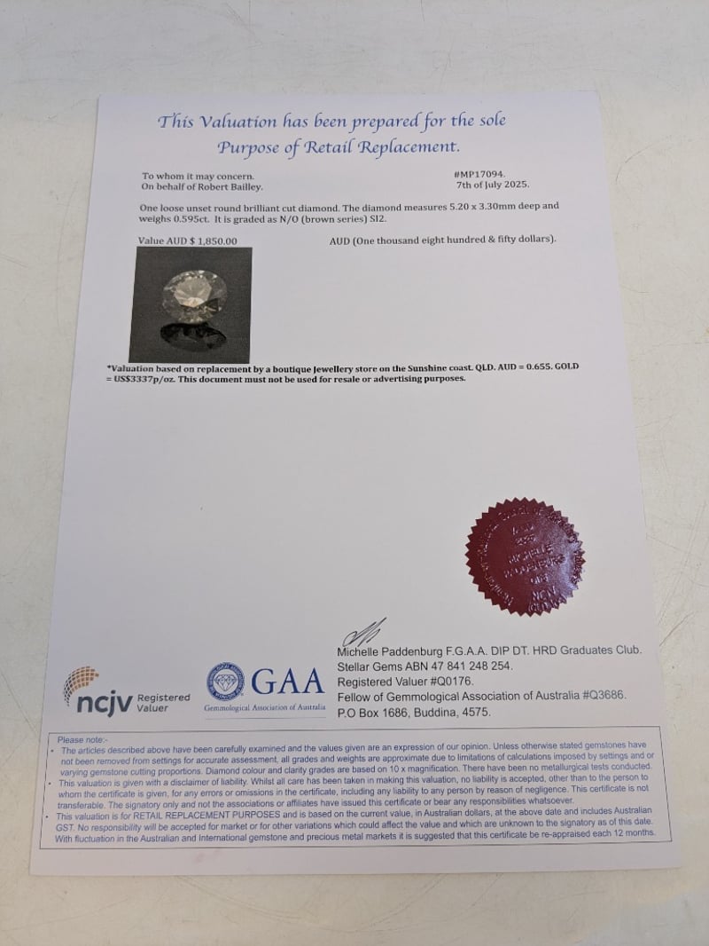 ROUND BRILLIANT CUT DIAMOND5.2 X 3.3Mm Deep, Weight = 0.595CtGrade = N/O (Brown Series) Si2Condition: Good - Refer To ImagesThis valuation has been conducted by an independent third-party professional. The valuation amount is an assessment by the issuing valuer and does not reflect the auction value of the item.Any inquiries regarding the valuation should be directed to the issuing valuer (refer to contact details on the certificate), as Lloyds Auctions has no affiliation or influence over the valuation, the valuer, or the stated amount.Insurance Replacement Valuation Amount: $1,850.00585025+56
