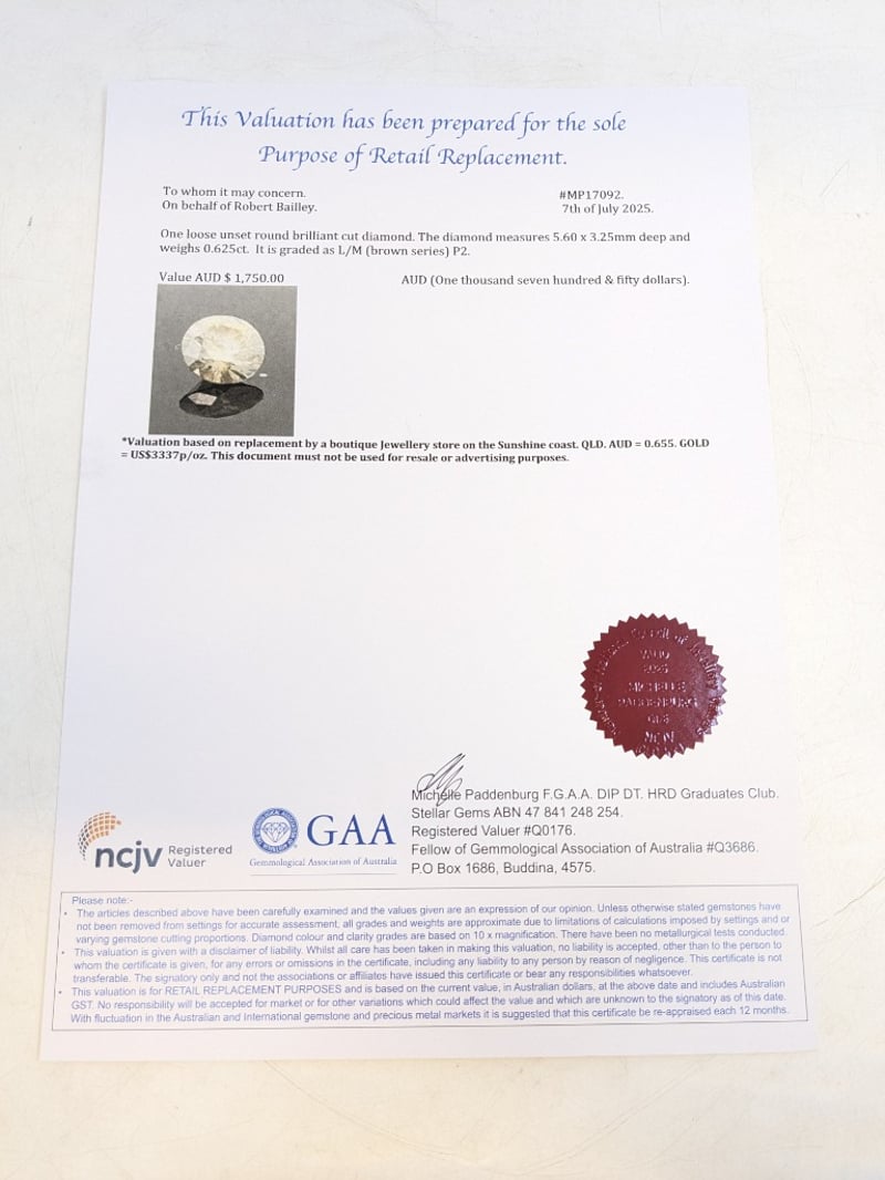ROUND BRILLIANT CUT DIAMOND5.6 X 3.25Mm Deep, Weight = 0.625CtGrade: L/M (Brown Series) P2Condition: Good - Refer To ImagesThis valuation has been conducted by an independent third-party professional. The valuation amount is an assessment by the issuing valuer and does not reflect the auction value of the item.Any inquiries regarding the valuation should be directed to the issuing valuer (refer to contact details on the certificate), as Lloyds Auctions has no affiliation or influence over the valuation, the valuer, or the stated amount.Insurance Replacement Valuation Amount: $1,750.00585025+57