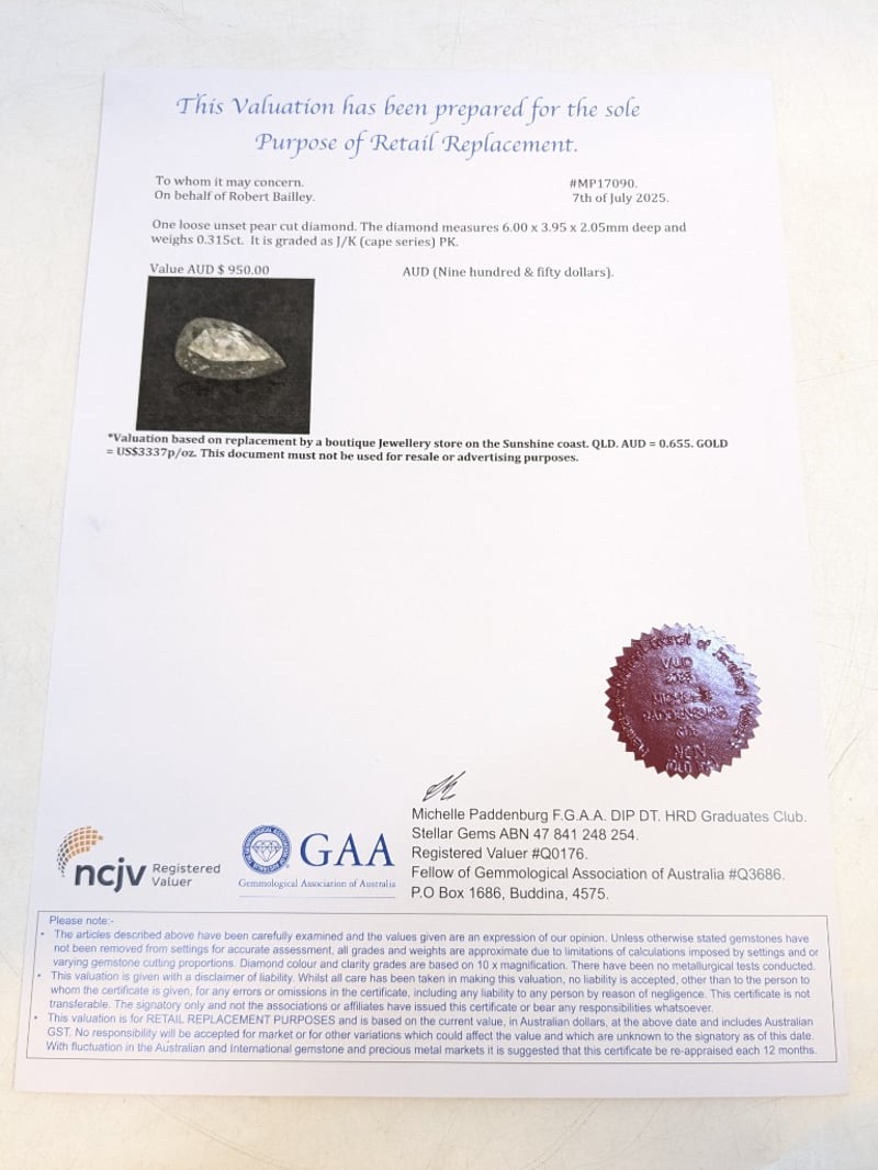 PEAR CUT DIAMOND6 X 3.95 X 2.05Mm Deep, Weight = 0.315CtGrade: J/K (Cape Series) PkCondition: Good - Refer To ImagesThis valuation has been conducted by an independent third-party professional. The valuation amount is an assessment by the issuing valuer and does not reflect the auction value of the item.Any inquiries regarding the valuation should be directed to the issuing valuer (refer to contact details on the certificate), as Lloyds Auctions has no affiliation or influence over the valuation, the valuer, or the stated amount.Insurance Replacement Valuation Amount: $950.00585025+63