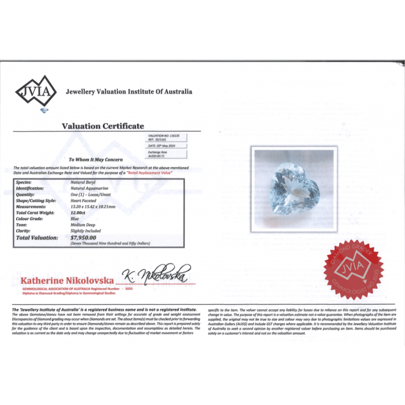 12.00CT NATURAL BERYL AQUAMARINE Heart Faceted Cut, Medium Deep Blue, Slightly Included, Loose, Unset. Jewellery Valuations Provided By A Third Party Professional Not Directly Associated With Lloyds Auctions at AUD $7,950.00This Insurance Valuation has been provided by a registered Jewellery Valuer and is intended for insurance purposes only. The valuation amount has no bearing on the auction value of the item. Any questions regarding the valuation should be directed to the issuing Valuer (refer to contact details on the certificate) as Lloyds have no association or relationship with the Valuer or the valuation amount contained within the valuation. Condition: NEW 0645894+2329