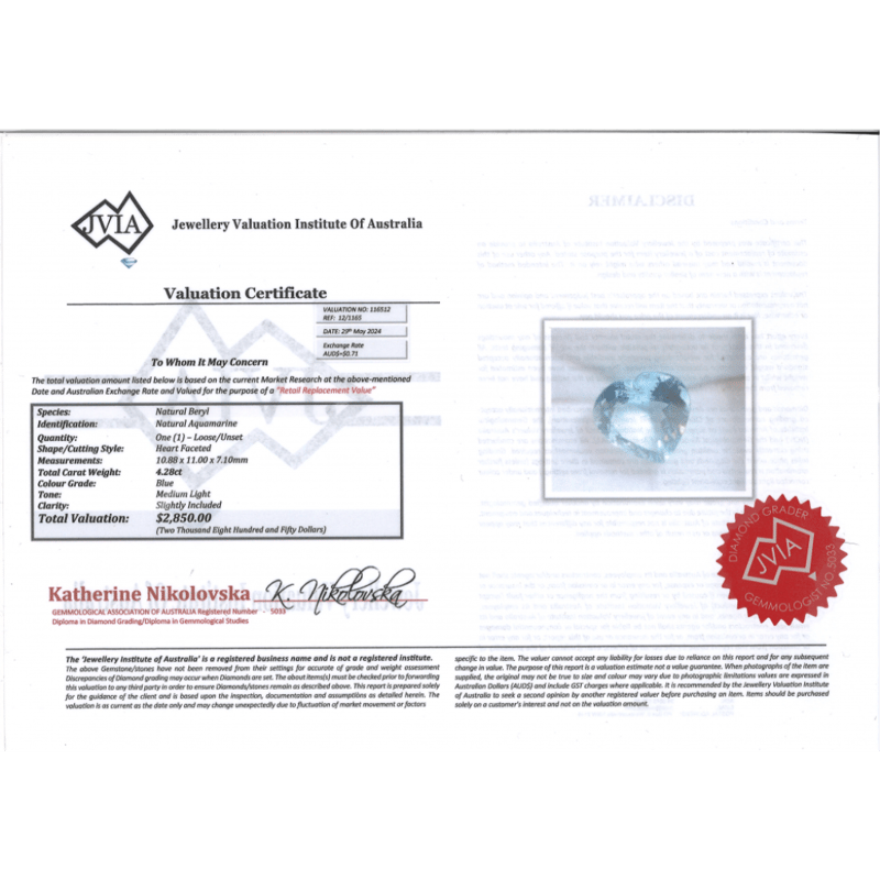 4.28CT NATURAL AQUAMARINE Heart Faceted Cut, Medium Light Greyish-Blue, Slightly Included, Loose, Unset. Jewellery Valuations Provided By A Third Party Professional Not Directly Associated With Lloyds Auctions at AUD $2,850.00This Insurance Valuation has been provided by a registered Jewellery Valuer and is intended for insurance purposes only. The valuation amount has no bearing on the auction value of the item. Any questions regarding the valuation should be directed to the issuing Valuer (refer to contact details on the certificate) as Lloyds have no association or relationship with the Valuer or the valuation amount contained within the valuation. Condition: NEW 0645894+2355