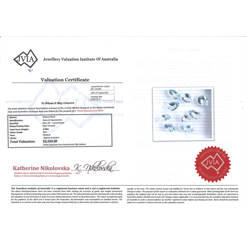 5.44 TSW X 9, NATURAL BERYL AQUAMARINES Pear Faceted Cut, Medium Light-Medium Deep Blue, Minor Inclusions-Slightly Included, Loose, Unset. Condition: New. Jewellery Valuations Provided By A Third Party Professional Not Directly Associated With Lloyds Auctions at AUD $3,550.00This Insurance Valuation has been provided by a registered Jewellery Valuer and is intended for insurance purposes only. The valuation amount has no bearing on the auction value of the item. Any questions regarding the valuation should be directed to the issuing Valuer (refer to contact details on the certificate) as Lloyds have no association or relationship with the Valuer or the valuation amount contained within the valuation. Condition: NEW 0645894+2377
