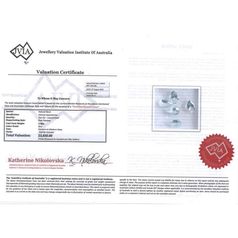5.38CT TSW X 5, NATURAL BERYL AQUAMARINES Pear Faceted Cut, Medium Light-Medium Deep Blue, Minor Inclusions-Slightly Included, Loose, Unset. Jewellery Valuations Provided By A Third Party Professional Not Directly Associated With Lloyds Auctions at AUD $3,650.00This Insurance Valuation has been provided by a registered Jewellery Valuer and is intended for insurance purposes only. The valuation amount has no bearing on the auction value of the item. Any questions regarding the valuation should be directed to the issuing Valuer (refer to contact details on the certificate) as Lloyds have no association or relationship with the Valuer or the valuation amount contained within the valuation. Condition: NEW 0645894+2379