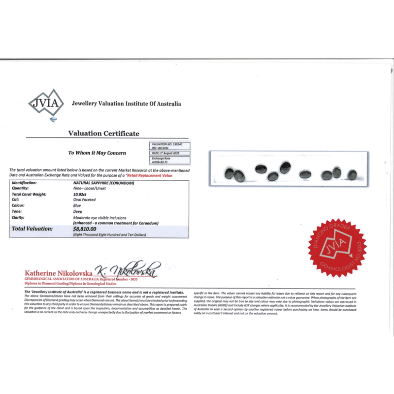 10.92CT TSW X 9, NATURAL BLUE CORUNDUM SAPPHIRES Oval Faceted Cut, Deep Blue, Moderate Eye Visible Inclusions, Enhanced, Loose, Unset. Jewellery Valuations Provided By A Third Party Professional Not Directly Associated With Lloyds Auctions at AUD $88,100.00This Insurance Valuation has been provided by a registered Jewellery Valuer and is intended for insurance purposes only. The valuation amount has no bearing on the auction value of the item. Any questions regarding the valuation should be directed to the issuing Valuer (refer to contact details on the certificate) as Lloyds have no association or relationship with the Valuer or the valuation amount contained within the valuation. Condition: NEW 0645894+2371