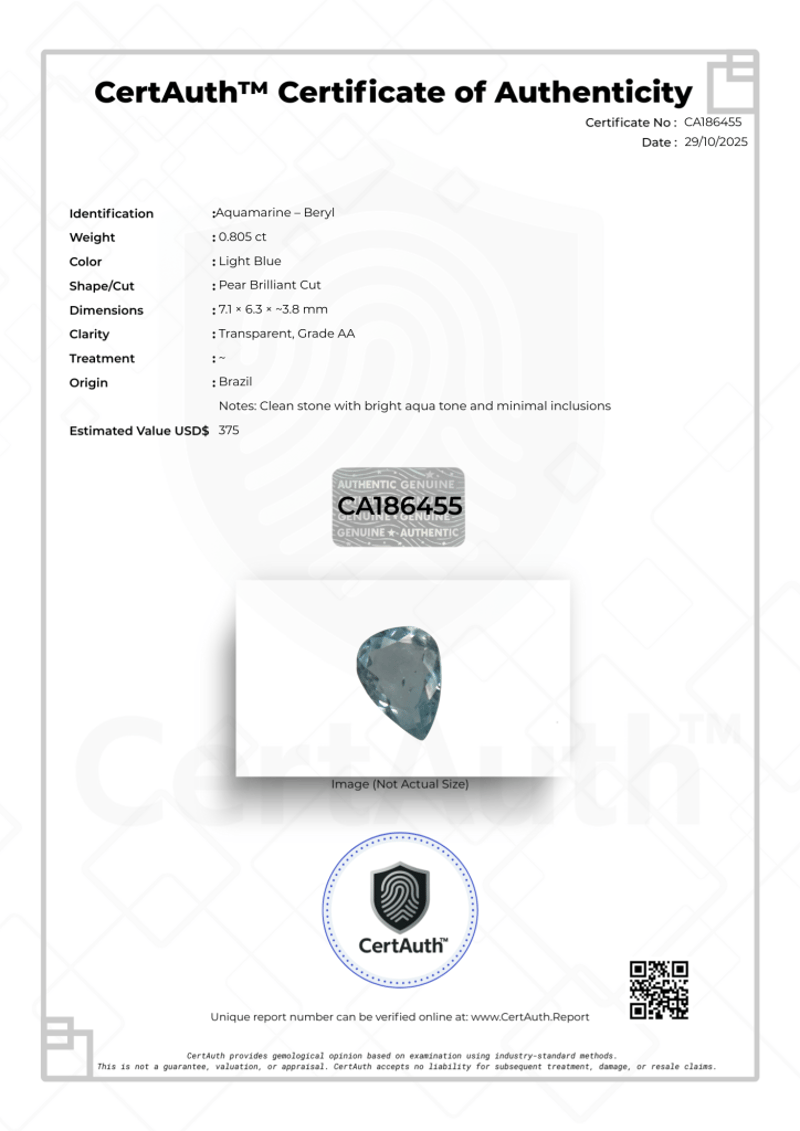 BRAZILIAN AQUAMARINE – 0.81CT, CERTIFIED BY CERTAUTH™
