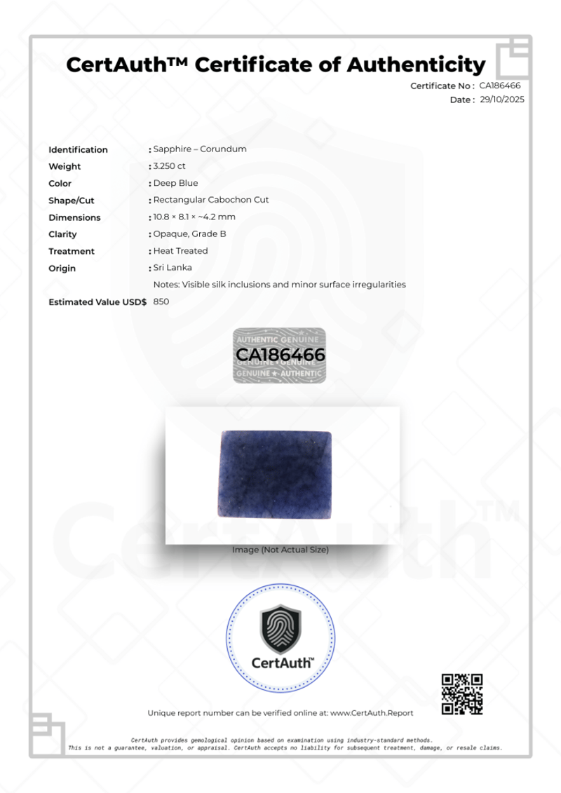 SRI LANKAN BLUE SAPPHIRE – 3.25CT, CERTIFIED BY CERTAUTH™