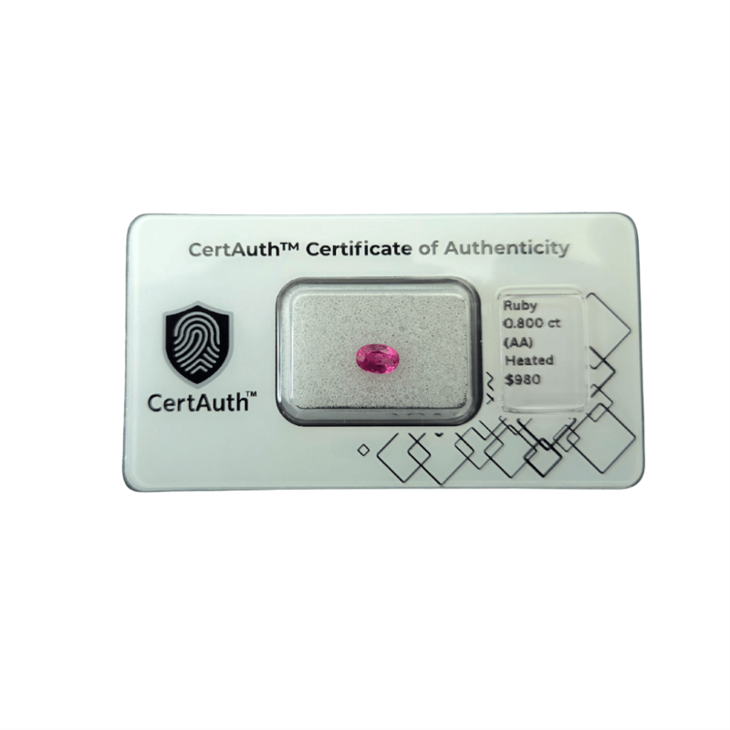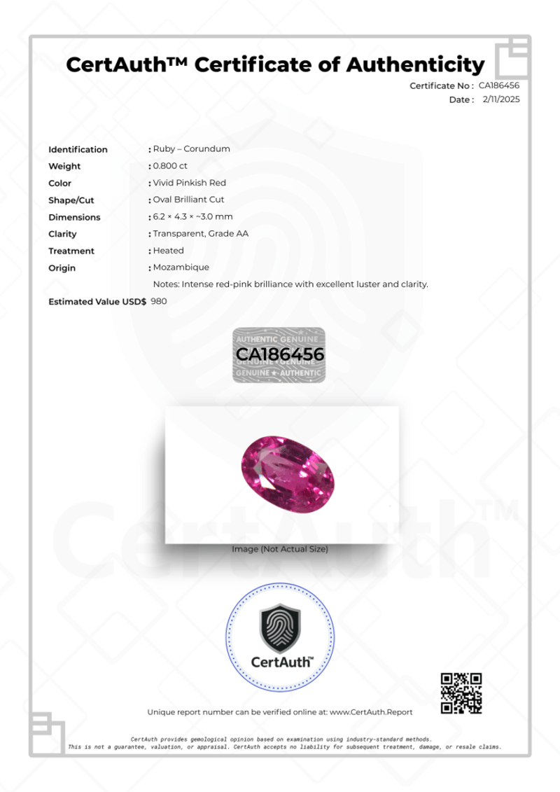 NATURAL RUBY – 0.80CT, CERTIFIED BY CERTAUTH A Striking Vivid Pinkish-Red Ruby From Mozambique Displaying Exceptional Brilliance And Clarity. Its Balanced Oval Cut Enhances The Gem’S Inner Fire And Lustre, Making It Ideal For A Fine Ring Or Pendant Setting.Details:• Gemstone: Ruby – Corundum• Weight: 0.800 Ct• Colour: Vivid Pinkish Red• Shape/Cut: Oval Brilliant Cut• Dimensions: 6.2 × 4.3 × ~3.0 Mm• Clarity: Transparent, Grade Aa• Treatment: Heated• Origin: Mozambique• Certification: Certauth No. Ca186456• Estimated Value: Usd $980Comments:Intense Red-Pink Brilliance With Excellent Lustre And High Transparency — A Premium Quality Ruby Suitable For Fine Jewellery. Condition: Good - Refer Images 0488342+186456