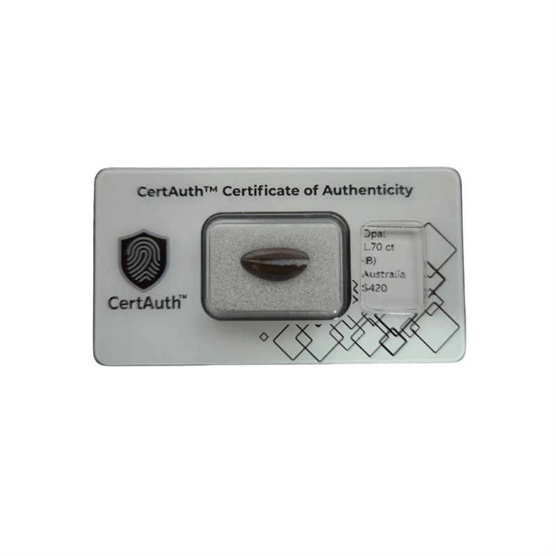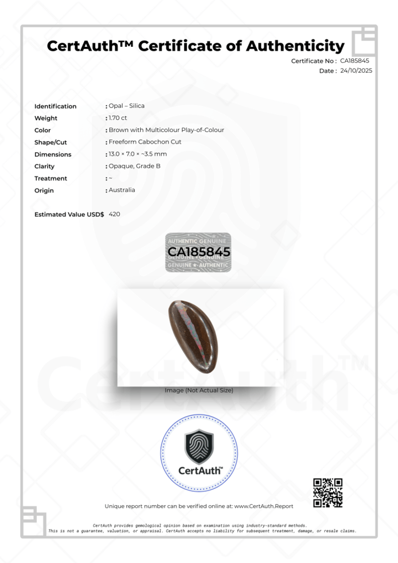 AUSTRALIAN BOULDER OPAL – 1.70CT, CERTIFIED BY CERTAUTH A Naturally Formed Australian Boulder Opal Featuring A Rich Brown Body Tone With Vibrant Multicolour Play-Of-Colour. The Gem’S Freeform Cabochon Cut Beautifully Highlights Its Organic Patterns And Flashes Of Red, Green, And Gold.Details:• Gemstone: Opal – Silica• Weight: 1.70 Ct• Colour: Brown With Multicolour Play-Of-Colour• Shape/Cut: Freeform Cabochon Cut• Dimensions: 13.0 × 7.0 × ~3.5 Mm• Clarity: Opaque, Grade B• Treatment: ~• Origin: Australia• Certification: Certauth No. Ca185845• Estimated Value: Usd $420Comments:Classic Australian Boulder Opal With Dynamic Play-Of-Colour And Natural Freeform Shaping — Perfect For A Pendant Or Collector’S Display Piece. Condition: Good - Refer Images 0488342+185845