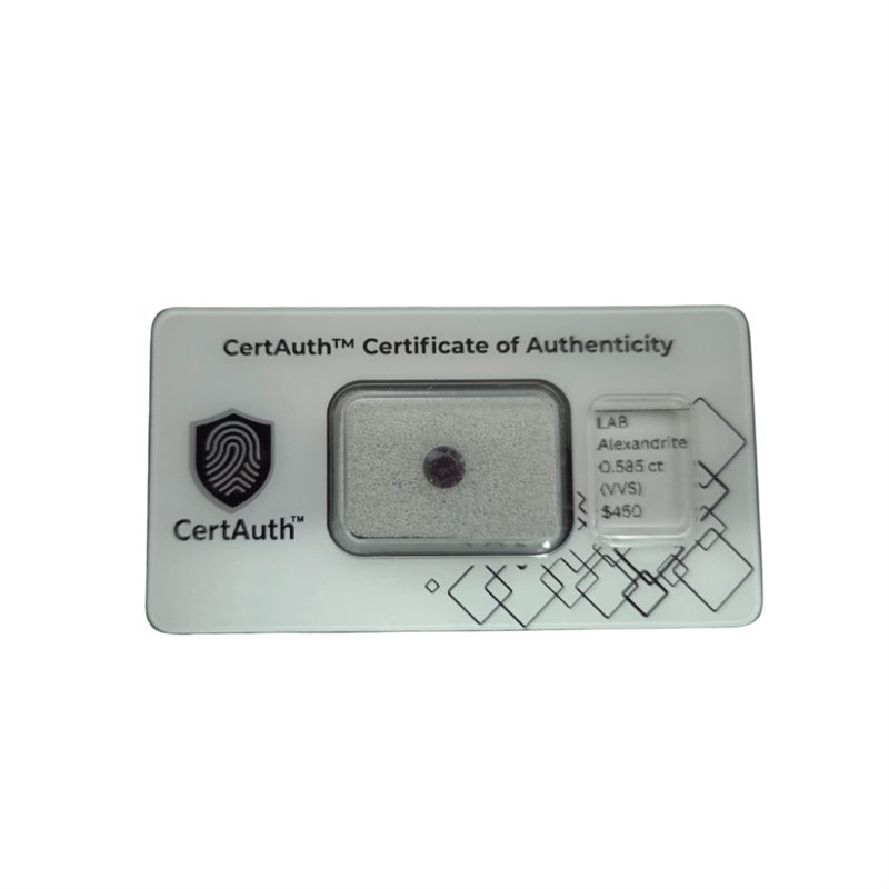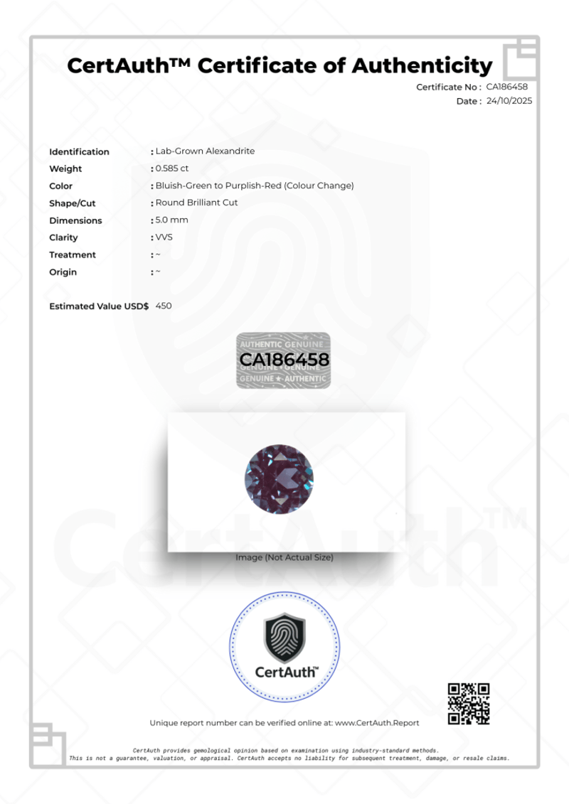 LAB-GROWN ALEXANDRITE – 0.585CT, CERTIFIED BY CERTAUTH A Striking Lab-Grown Alexandrite Exhibiting A Vivid And Well-Defined Colour Change From Bluish-Green Under Daylight To Purplish-Red Under Incandescent Light. Precision Cut In A Round Brilliant Form, This Gemstone Showcases Exceptional Clarity And Sparkle.Details:• Gemstone: Lab-Grown Alexandrite• Weight: 0.585 Ct• Colour: Bluish-Green To Purplish-Red (Colour Change)• Shape/Cut: Round Brilliant Cut• Dimensions: 5.0 Mm• Clarity: Vvs• Treatment: ~• Origin: ~• Certification: Certauth No. Ca186458• Estimated Value: Usd $450Comments:Excellent Colour Shift And Near-Flawless Clarity. A Highly Desirable Collector’S Gem Or Ideal Centrepiece For A Custom Jewellery Design. Condition: Good - Refer Images 0488342+186458