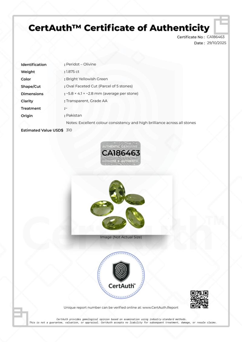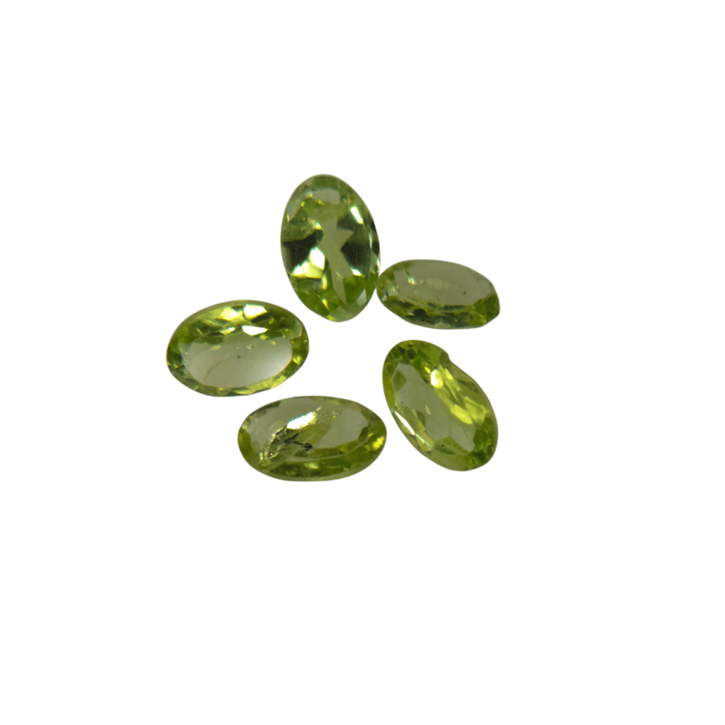 A Bright And Lively Set Of Five Oval-Cut Peridots From Pakistan, Showing A Consistent Yellowish-Green Tone And High Brilliance. Perfectly Matched In Size And Colour, Making Them Ideal For Earrings, Rings, Or A Small Cluster Pendant.