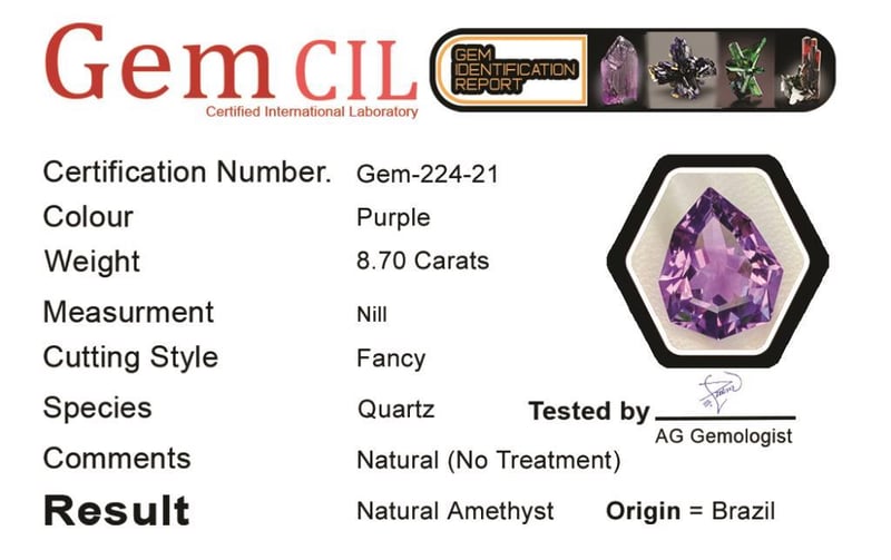 8.70 CARATS NATURAL QUALITY BRAZILIAN AMETHYST 8.70 Carats Natural Quality Brazilian AmethystStone = Natural AmethystWeight = 8.70 CaratsTreatment = Natural Colour = Purple Cut = Fancy Note = Gem Cil, Certified, Precise Custom Cut (Not Commercial) 0+21