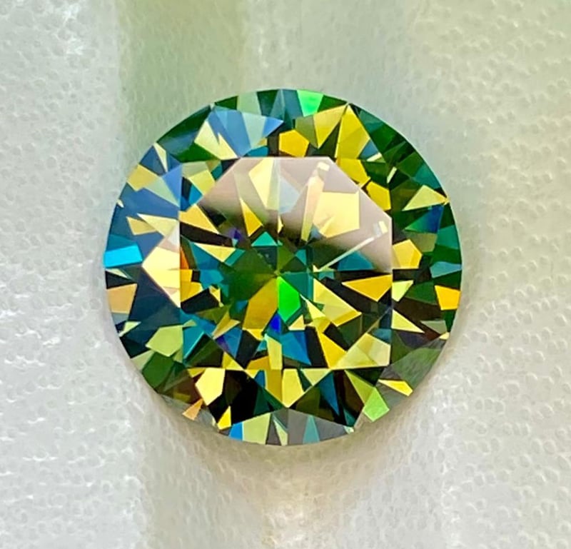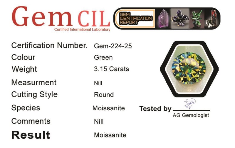 3.15 CARATS SPARKLING MOISSANITE 3.15 Carats Sparkling MoissaniteStone = MoissaniteWeight = 3.15 Carats Colour = GreenCut = RoundLustre = ExcellentNote = Gem Cil, Certified, 0+25