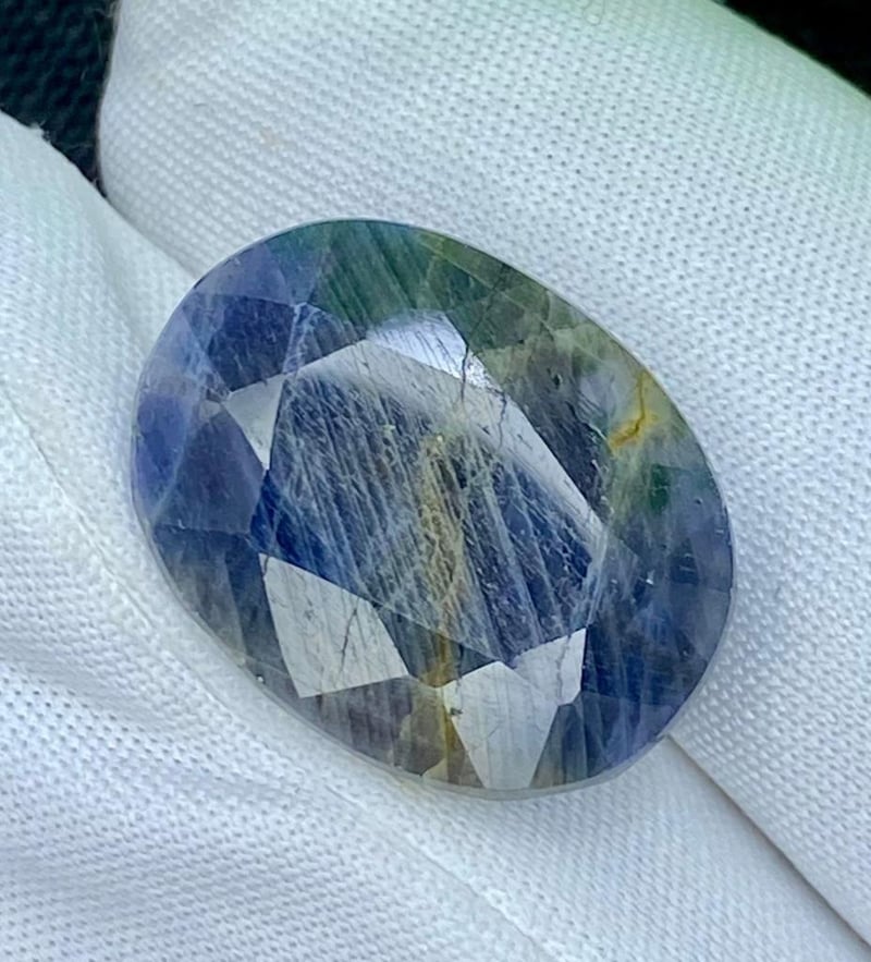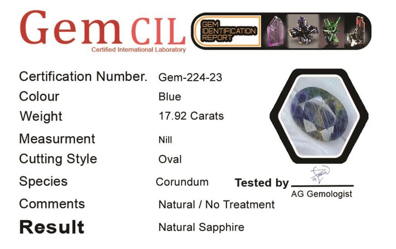 17.92 CARATS NATURAL CERTIFIED SAPPHIRE 17.92 Carats Natural Certified Sapphire Stone = Natural SapphireWeight = 17.92 Carats Cut = Oval Colour = Gray/BlueLustre = ExcellentTreatment = Natural (No Treatment Detected) Note = Gem Cil, Certified, Precise Custom Cut (Not Commercial) 0+23