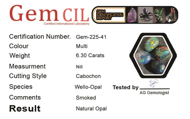 6.30 CARATS NATURAL WELLO-BLACK OPAL LOT 6.30 Carats Natural Wello-Black Opal LotStone = OpalWeight = 6.30 CaratsColour = Multi-Colour Treatment = SmokedCut = Cabochon Note = Picture Taken Under Light, Gem Cil, Certified. Condition: Good 0+41