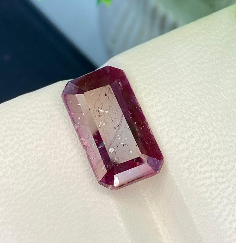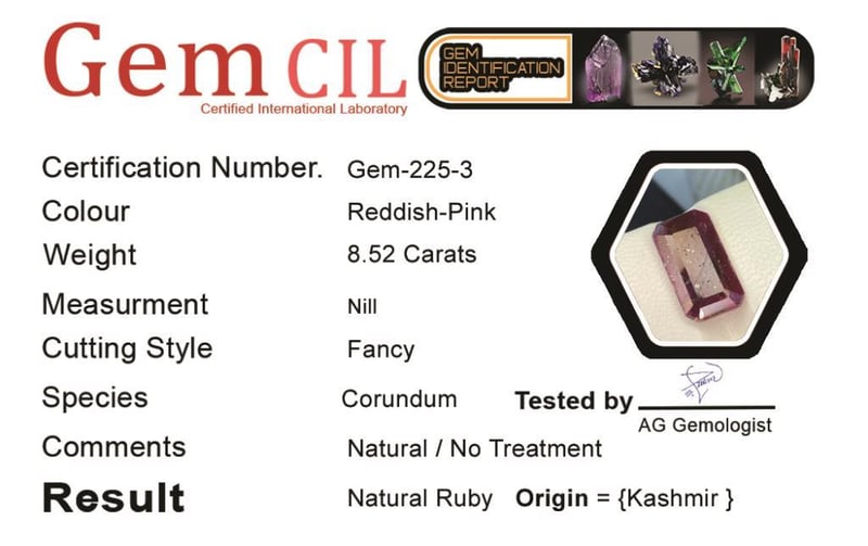 8.52 CARATS NATURAL KASHMIR RUBY 8.52 Carats Natural Kashmir RubyStone = RubyWeight = 8.52 CaratsTreatment = Natural-No Treatment Colour = Reddish-PinkCut = FancyLustre = ExcellentOrigin = Kashmir Note = Gem Cil, Certified, Precise Custom Cut (Not Commercial) Condition: Good 0+3