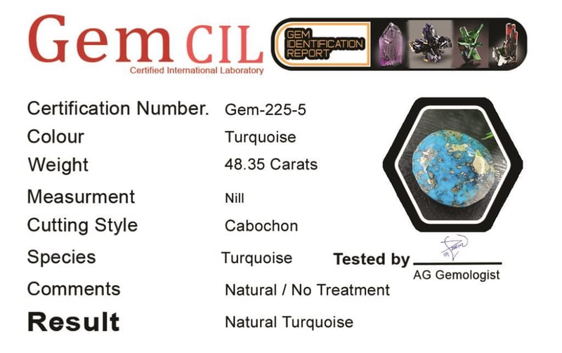 48.35 CARATS NATURAL QUALITY TURQUOISE 48.35 Carats Natural Quality Turquoise Stone = Natural TurquoiseWeight = 48.35 Carats Cut = Cabochon Colour = TurquoiseQuantity = 1Note = Gem Cil, Certified, Condition: Good 0+5