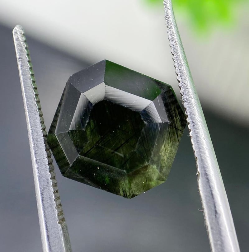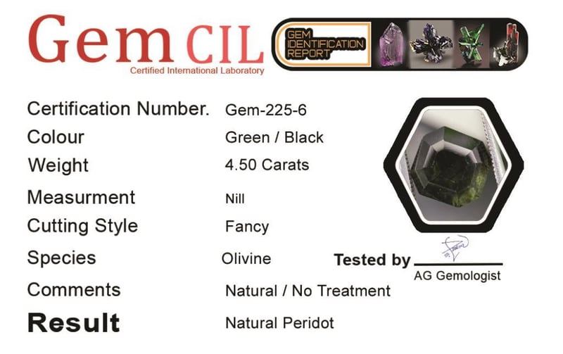 4.50 CARATS NATURAL RARE LOUDGITE PERIDOT 4.50 Carats Natural Rare Loudgite PeridotStone = Natural PeridotWeight = 4.50 CaratsColour = Green / BlackCut = Fancy Inclusion = LoudgiteNote = Gem Cil, Certified, Precise Custom Cut (Not Commercial) Condition: Good 0+6
