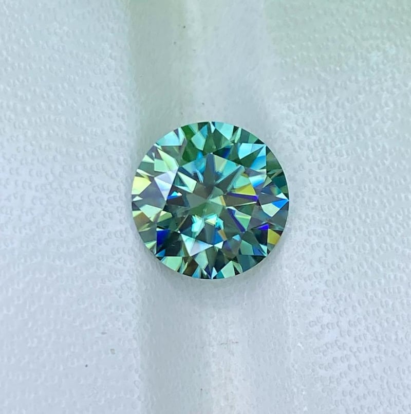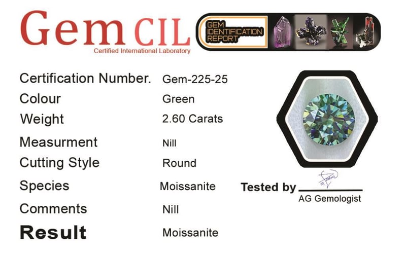 2.60 CARATS SPARKLING MOISSANITE 2.60 Carats Sparkling MoissaniteStone = MoissaniteWeight = 2.60 Carats Colour = GreenCut = RoundLustre = ExcellentNote = Gem Cil, Certified, Condition: Good 0+25
