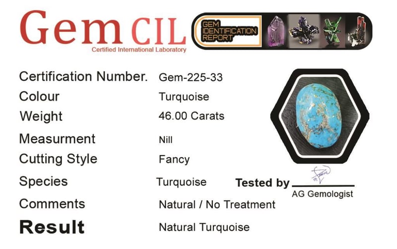 46.00 CARATS NATURAL QUALITY TURQUOISE 46.00 Carats Natural Quality Turquoise Stone = Natural TurquoiseWeight = 46.00 Carats Cut = Cabochon Colour = TurquoiseQuantity = 1Note = Gem Cil, Certified, Condition: Good 0+33