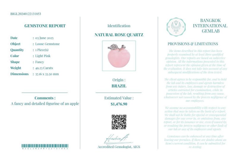 49.23 CARATS CERTIFIED NATURAL ROSE QUARTZ Gemstone : Natural Rose QuartzCertificate Number : Bigl20240122131853Weight : 49.23 CaratsColor : Light PinkMeasurement : 37.16 X 33.50 MmShape : FancyQuantity : 1 PieceOrigin : BrazilComments : A Fancy And Detailed Figurine Of An Apple• Use The Qr Code On The Packaging To View And Download The Certificate. • Verify Report Online At Www.Bangkokinternationalgemlab.Co 0+10