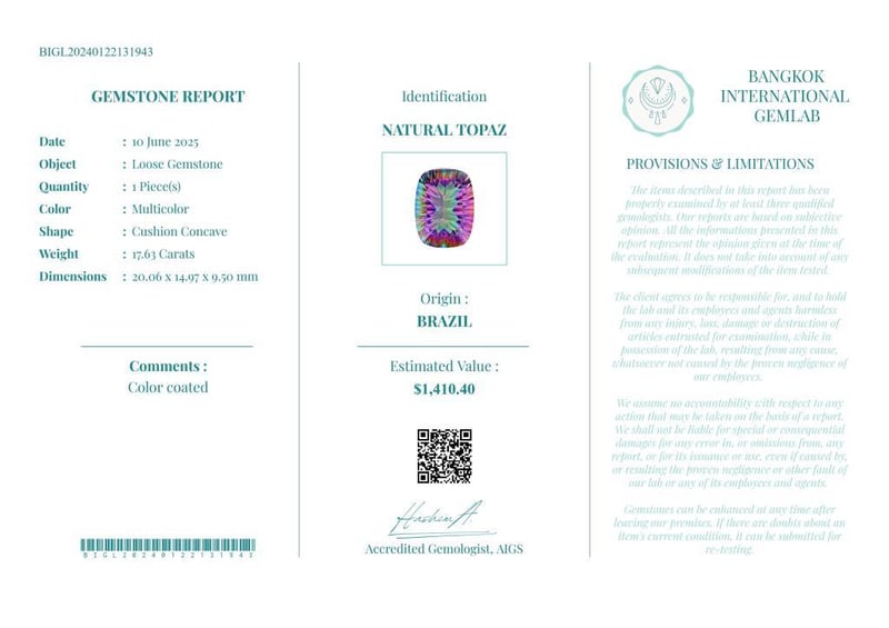 17.63 CARATS CERTIFIED NATURAL TOPAZ Gemstone : Natural TopazCertificate Number : Bigl20240122131943Weight : 17.63 CaratsColor : MulticolorMeasurement : 20.06 X 14.97 X 9.50 MmShape : Cushion ConcaveQuantity : 1 PieceOrigin : BrazilComments : Color Coated• Use The Qr Code On The Packaging To View And Download The Certificate. • Verify Report Online At Www.Bangkokinternationalgemlab.Co 0+16