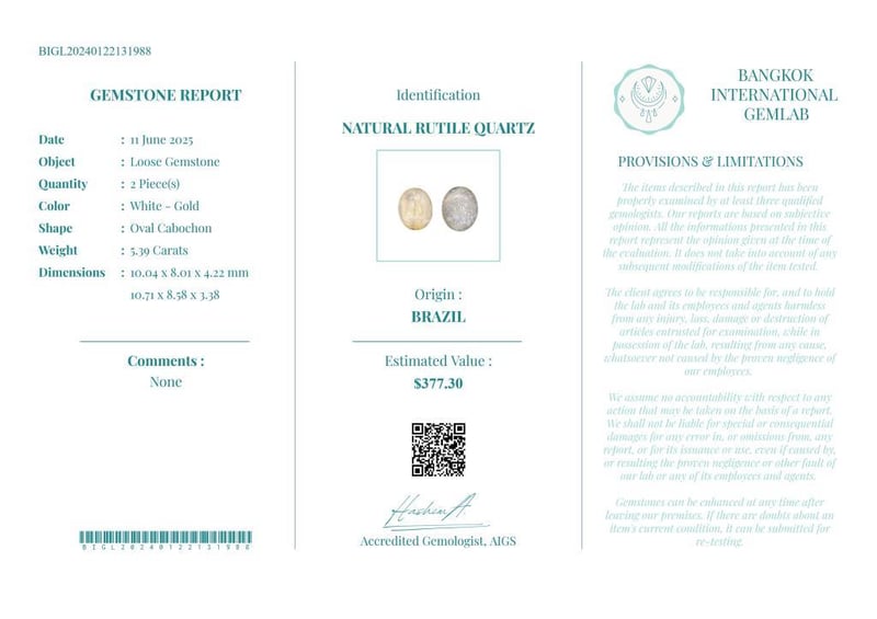5.39 CARATS CERTIFIED NATURAL RUTILE QUARTZ Gemstone : Natural Rutile QuartzCertificate Number : Bigl20240122131988Weight : 5.39 CaratsColor : White - GoldMeasurement : 10.04 X 8.01 X 4.22 MmShape : Oval CabochonQuantity : 2 PieceOrigin : BrazilComments : None• Use The Qr Code On The Packaging To View And Download The Certificate. • Verify Report Online At Www.Bangkokinternationalgemlab.Co 0+19