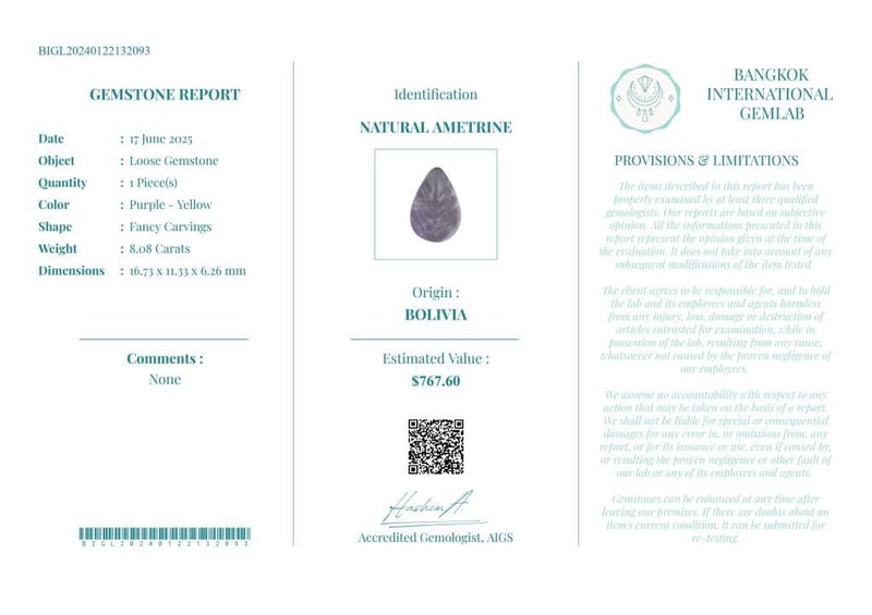 8.08 CARATS CERTIFIED NATURAL AMETRINE Gemstone : Natural AmetrineCertificate Number : Bigl20240122132093Weight : 8.08 CaratsColor : Purple - YellowMeasurement : 16.73 X 11.33 X 6.26 MmShape : Fancy CarvingsQuantity : 1 PieceOrigin : BoliviaComments : None• Use The Qr Code On The Packaging To View And Download The Certificate. • Verify Report Online At Www.Bangkokinternationalgemlab.Co 0+26
