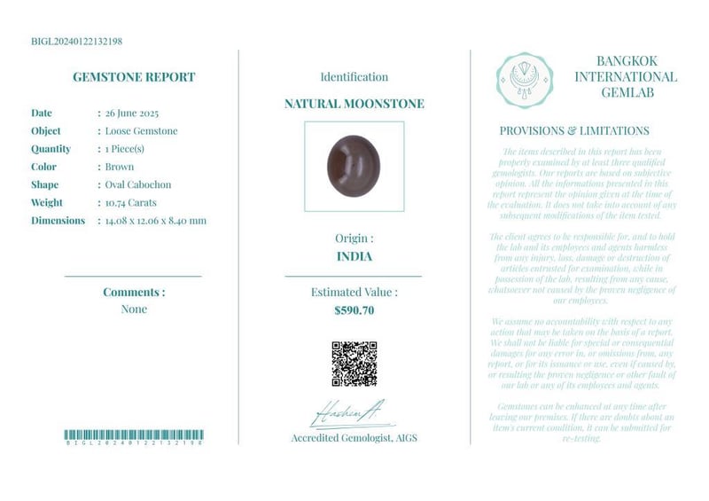 10.74 CARATS CERTIFIED NATURAL MOONSTONE Gemstone : Natural MoonstoneCertificate Number : Bigl20240122132198Weight : 10.74 CaratsColor : BrownMeasurement : 14.08 X 12.06 X 8.40 MmShape : Oval CabochonQuantity : 1 PieceOrigin : IndiaComments : None• Use The Qr Code On The Packaging To View And Download The Certificate. • Verify Report Online At Www.Bangkokinternationalgemlab.Co 0+33
